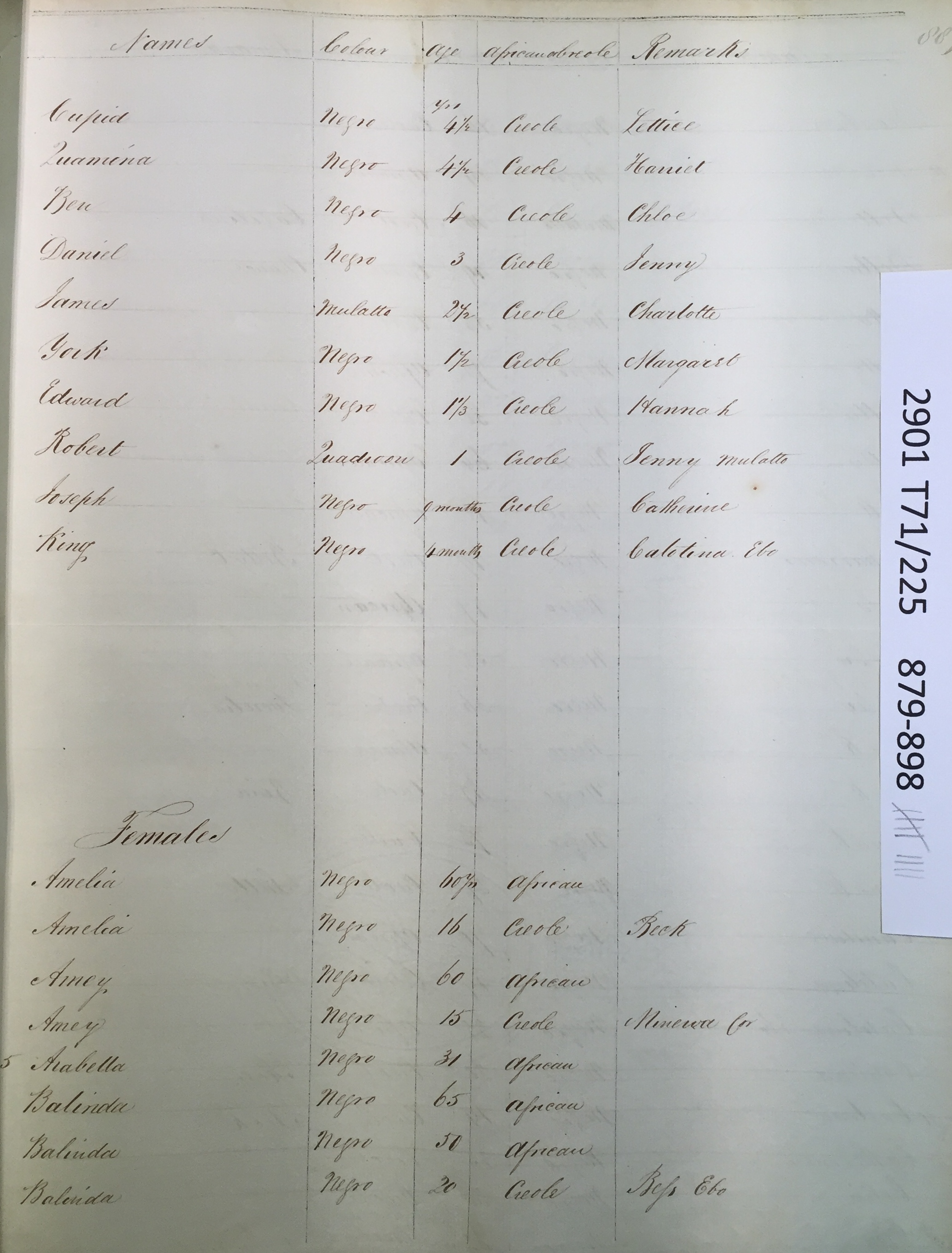 Slave register entry for Good Hope estate in 1817, page 9 of 19. T71/225 pp. 879-897. © Images reproduced by permission of The National Archives, London, England. The National Archives give no warranty as to the accuracy, completeness or fitness for the purpose of the information provided. Images may be used only for purposes of research, private study or education. Applications for any other use should be made to The National Archives, Kew, Richmond, Surrey TW9 4DU, Tel: 020 8392 5225 Fax: 020 8392 5266.