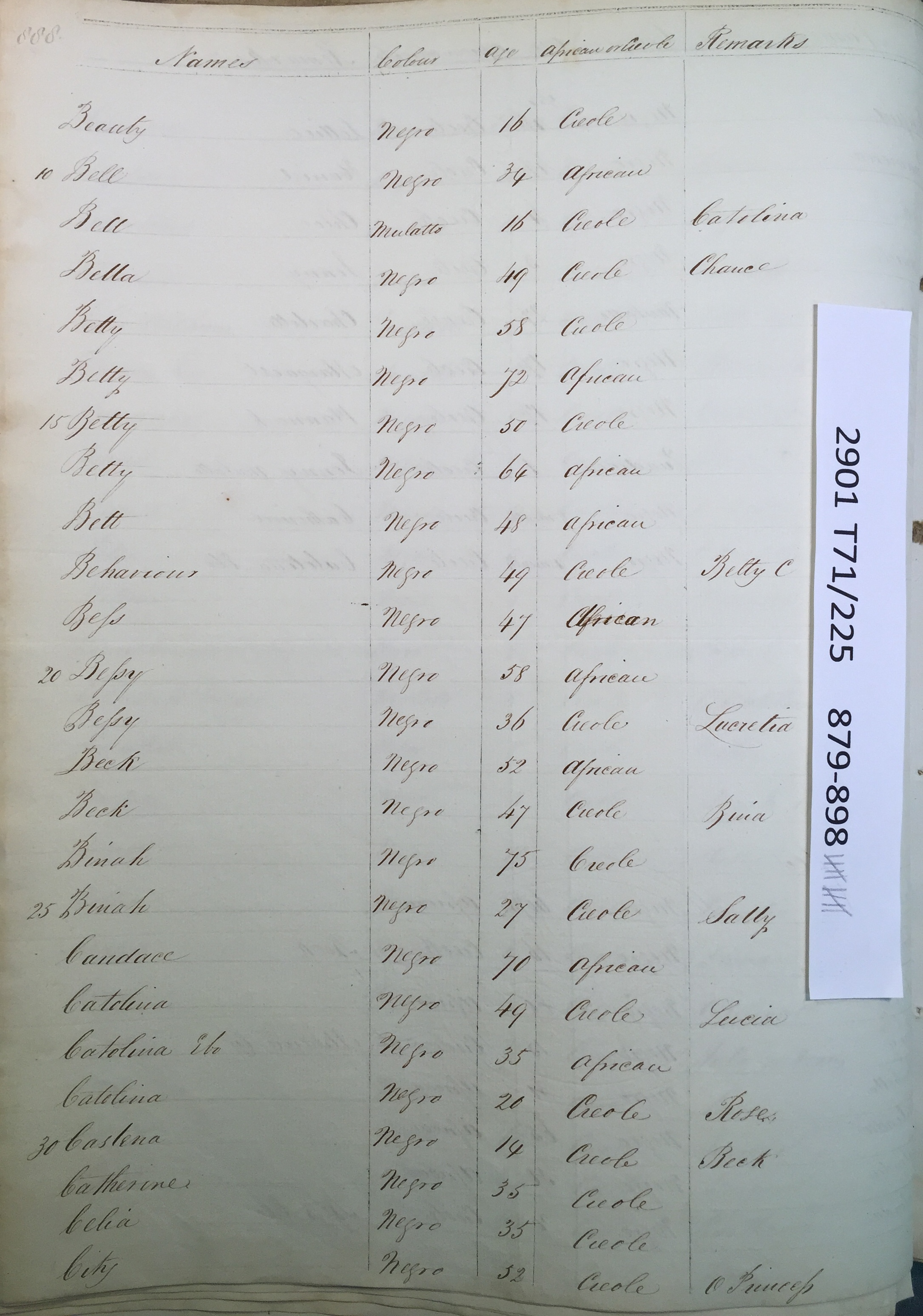 Slave register entry for Good Hope estate in 1817, page 10 of 19. T71/225 pp. 879-897. © Images reproduced by permission of The National Archives, London, England. The National Archives give no warranty as to the accuracy, completeness or fitness for the purpose of the information provided. Images may be used only for purposes of research, private study or education. Applications for any other use should be made to The National Archives, Kew, Richmond, Surrey TW9 4DU, Tel: 020 8392 5225 Fax: 020 8392 5266.