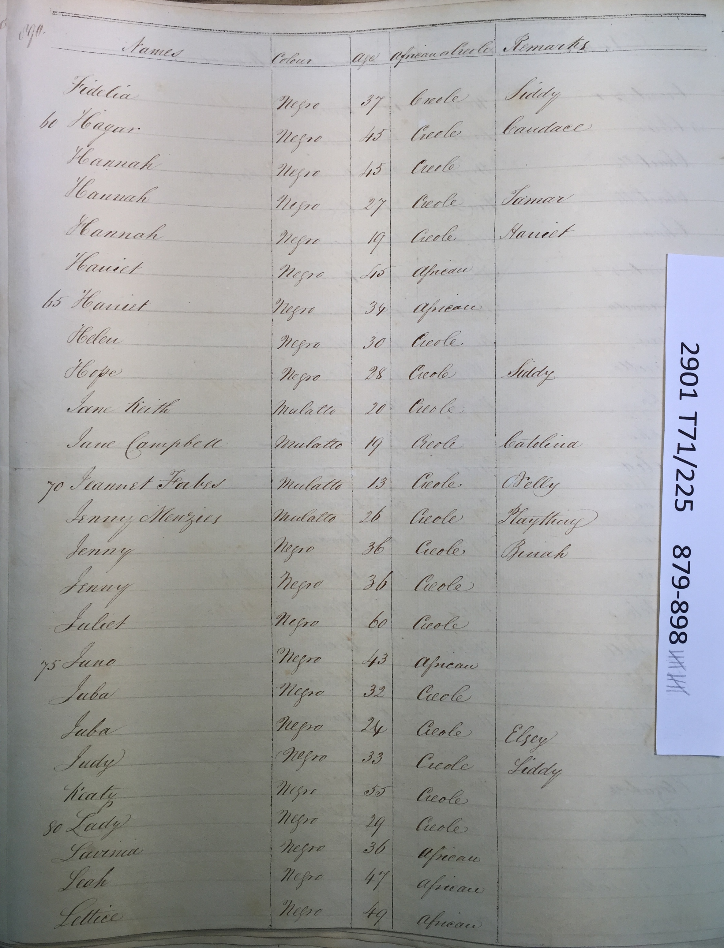 Slave register entry for Good Hope estate in 1817, page 12 of 19. T71/225 pp. 879-897. © Images reproduced by permission of The National Archives, London, England. The National Archives give no warranty as to the accuracy, completeness or fitness for the purpose of the information provided. Images may be used only for purposes of research, private study or education. Applications for any other use should be made to The National Archives, Kew, Richmond, Surrey TW9 4DU, Tel: 020 8392 5225 Fax: 020 8392 5266.
