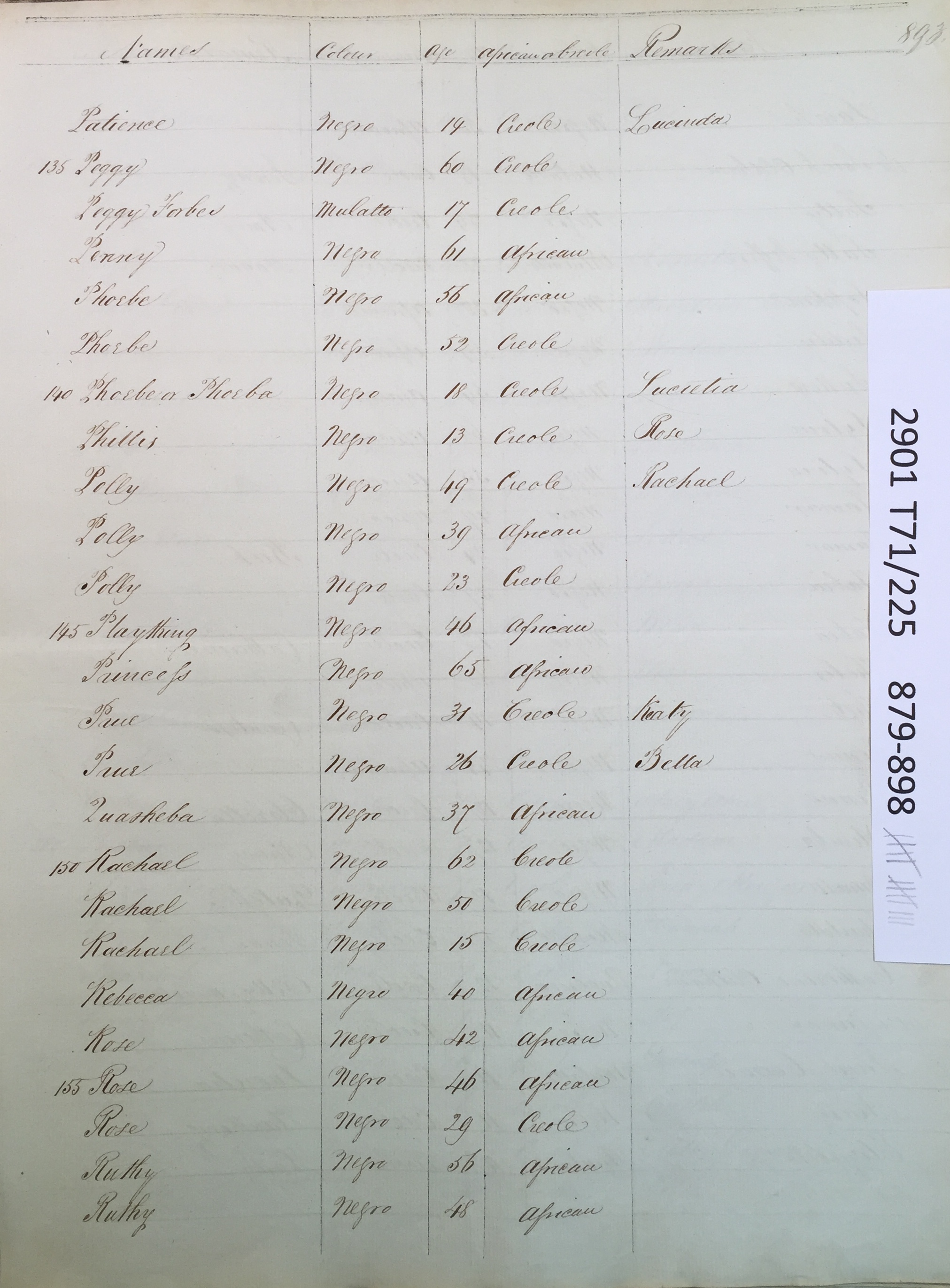 Slave register entry for Good Hope estate in 1817, page 15 of 19. T71/225 pp. 879-897. © Images reproduced by permission of The National Archives, London, England. The National Archives give no warranty as to the accuracy, completeness or fitness for the purpose of the information provided. Images may be used only for purposes of research, private study or education. Applications for any other use should be made to The National Archives, Kew, Richmond, Surrey TW9 4DU, Tel: 020 8392 5225 Fax: 020 8392 5266.