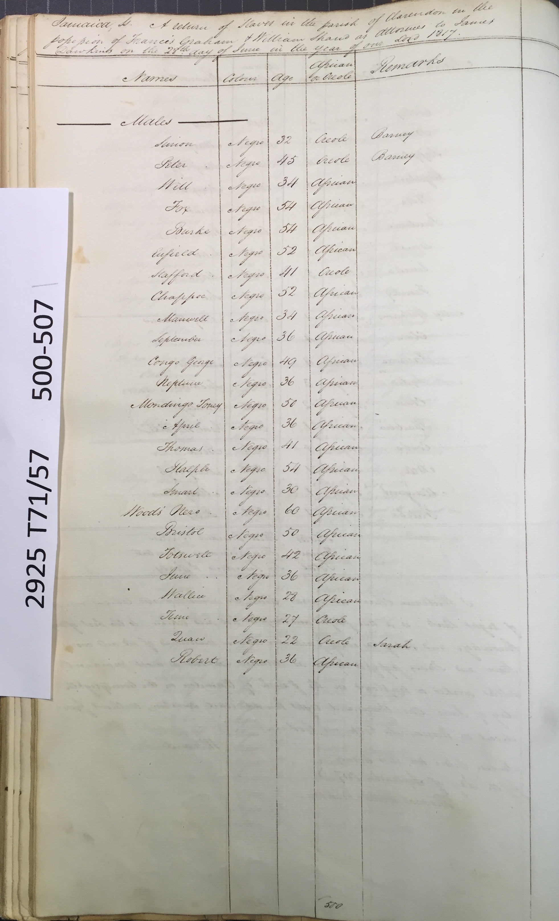 Slave register entry for Sutton's estate in 1817, page 1 of 8. T71/57 pp. 500-507. © Images reproduced by permission of The National Archives, London, England. The National Archives give no warranty as to the accuracy, completeness or fitness for the purpose of the information provided. Images may be used only for purposes of research, private study or education. Applications for any other use should be made to The National Archives, Kew, Richmond, Surrey TW9 4DU, Tel: 020 8392 5225 Fax: 020 8392 5266.