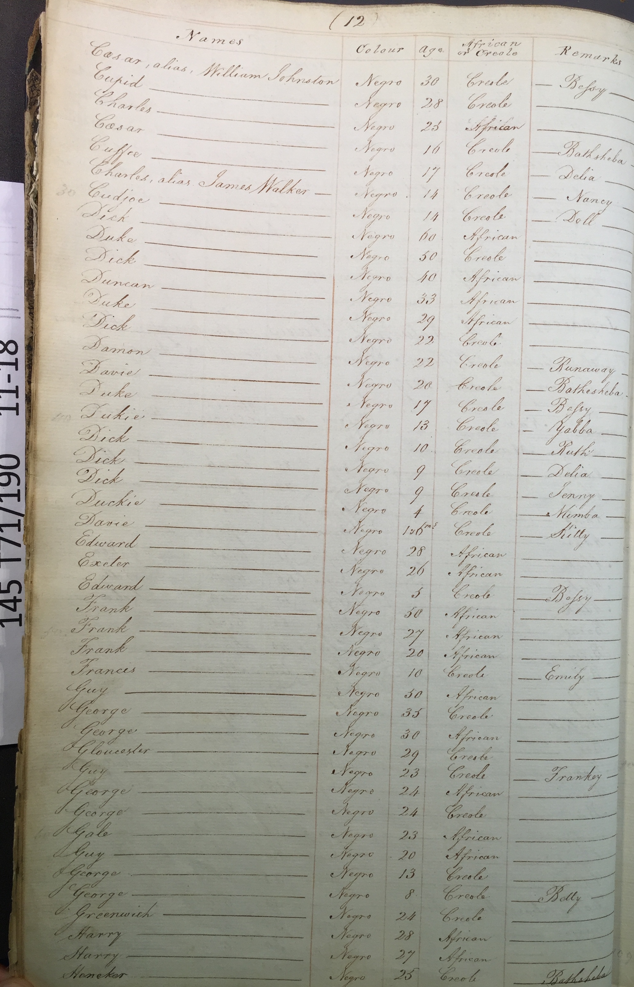 Slave register entry for Sutton's estate in 1817, page 2 of 8. T71/57 pp. 500-507. © Images reproduced by permission of The National Archives, London, England. The National Archives give no warranty as to the accuracy, completeness or fitness for the purpose of the information provided. Images may be used only for purposes of research, private study or education. Applications for any other use should be made to The National Archives, Kew, Richmond, Surrey TW9 4DU, Tel: 020 8392 5225 Fax: 020 8392 5266.