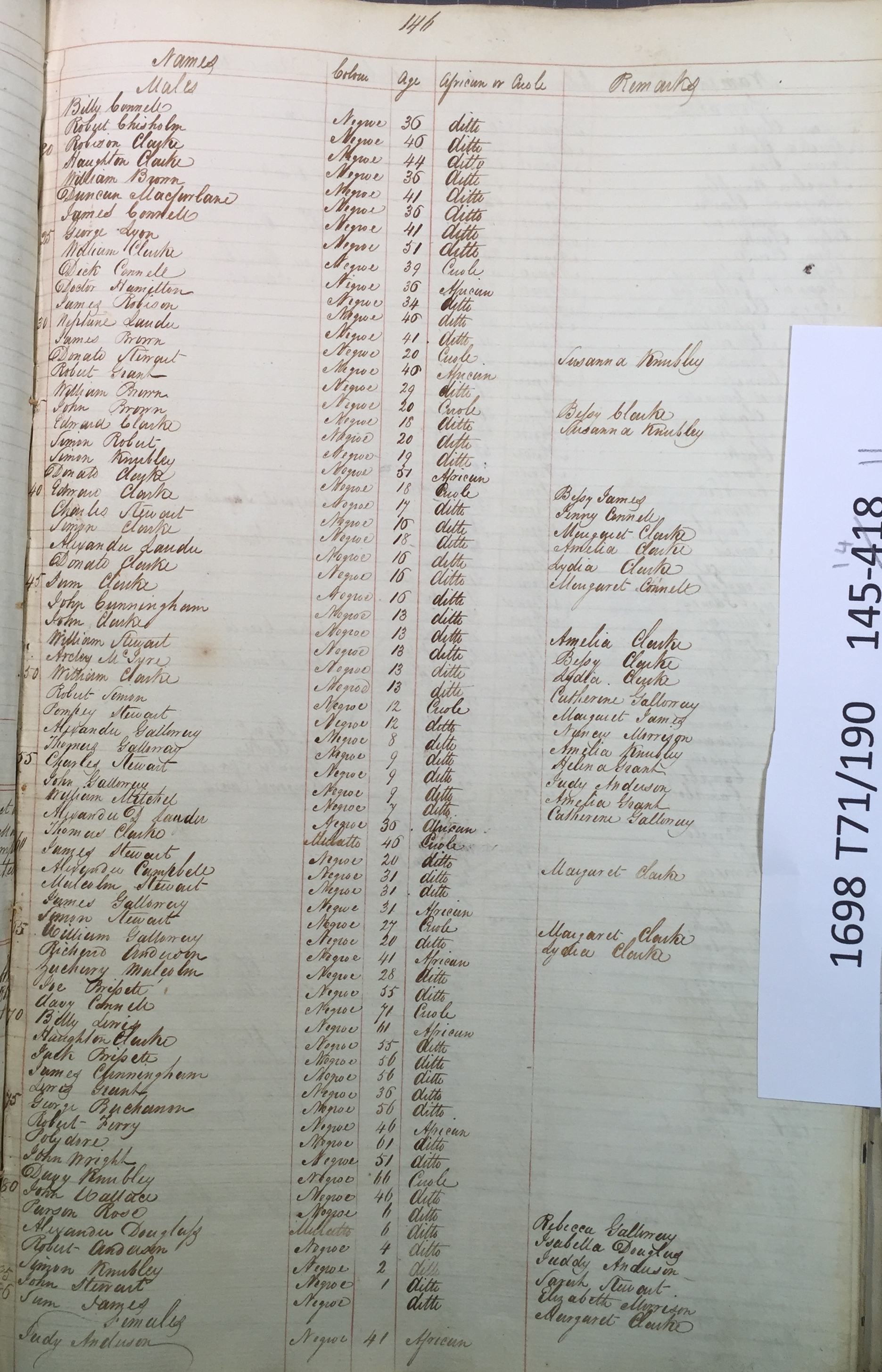 Slave register entry for Woodchurch estate in 1817, page 2 of 4. T71/190 pp. 145-148. © Images reproduced by permission of The National Archives, London, England. The National Archives give no warranty as to the accuracy, completeness or fitness for the purpose of the information provided. Images may be used only for purposes of research, private study or education. Applications for any other use should be made to The National Archives, Kew, Richmond, Surrey TW9 4DU, Tel: 020 8392 5225 Fax: 020 8392 5266.