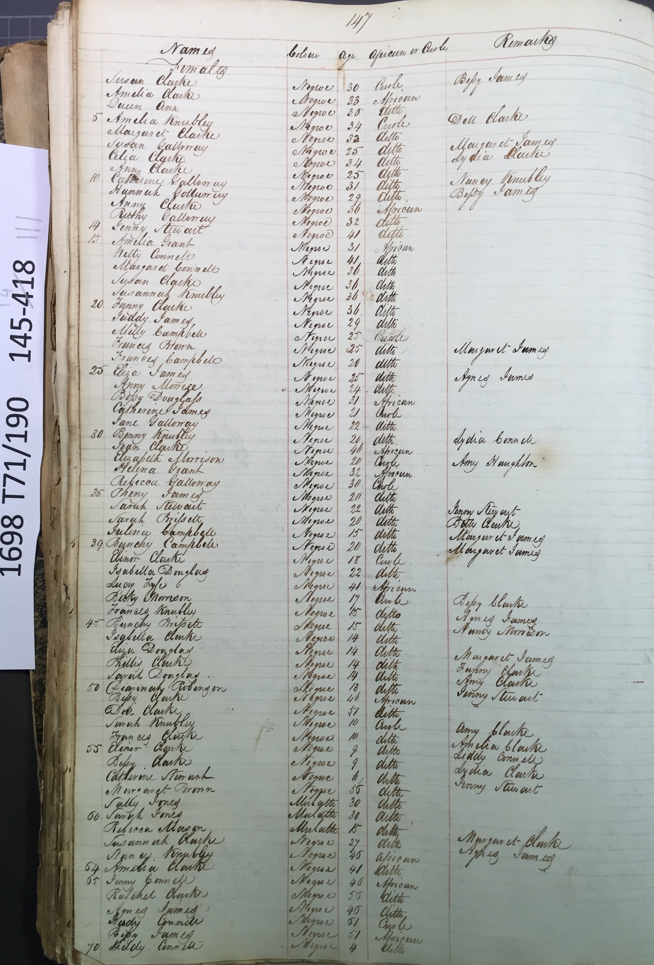 Slave register entry for Woodchurch estate in 1817, page 3 of 4. T71/190 pp. 145-148. © Images reproduced by permission of The National Archives, London, England. The National Archives give no warranty as to the accuracy, completeness or fitness for the purpose of the information provided. Images may be used only for purposes of research, private study or education. Applications for any other use should be made to The National Archives, Kew, Richmond, Surrey TW9 4DU, Tel: 020 8392 5225 Fax: 020 8392 5266.