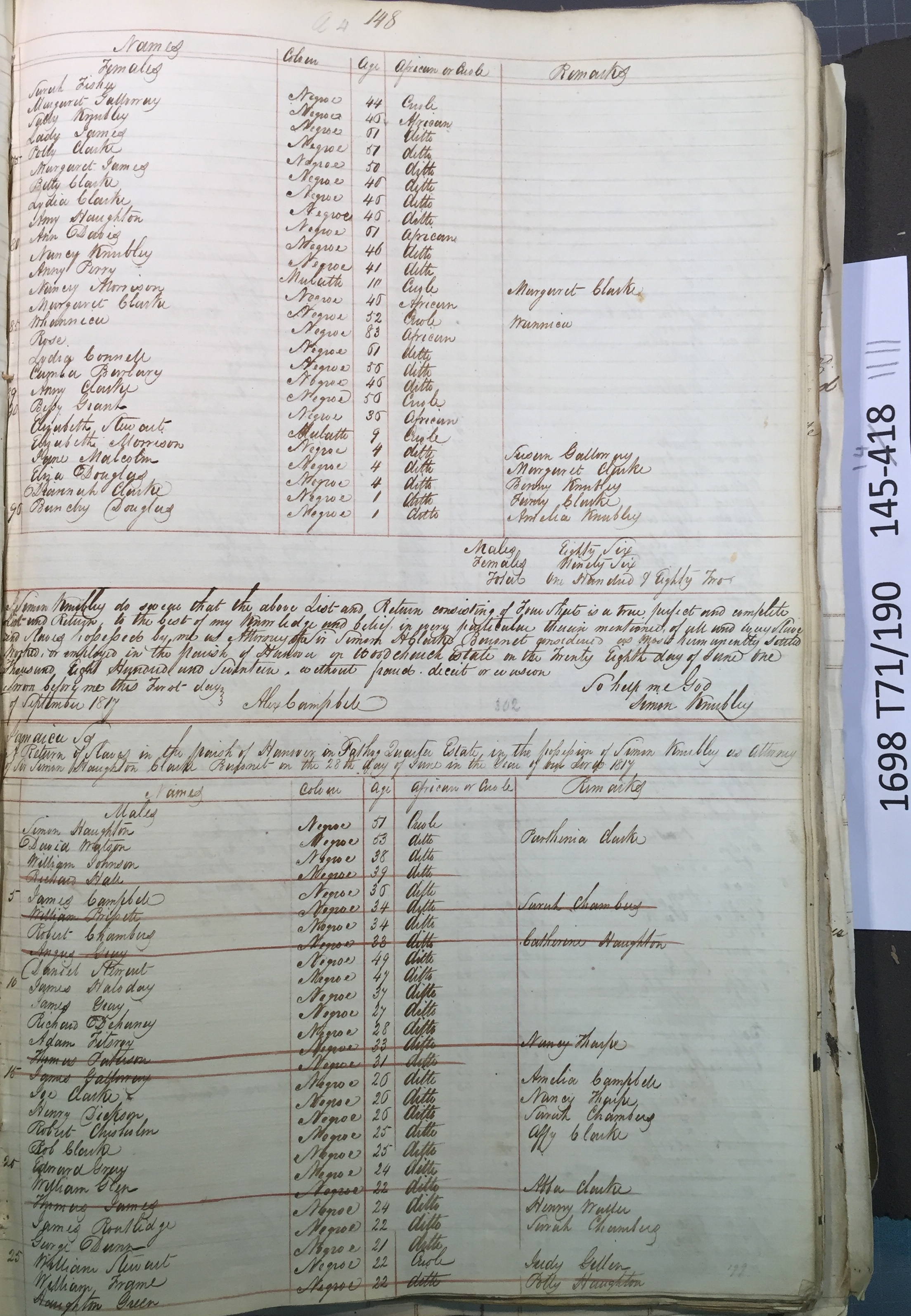 Slave register entry for Woodchurch estate in 1817, page 4 of 4. T71/190 pp. 145-148. © Images reproduced by permission of The National Archives, London, England. The National Archives give no warranty as to the accuracy, completeness or fitness for the purpose of the information provided. Images may be used only for purposes of research, private study or education. Applications for any other use should be made to The National Archives, Kew, Richmond, Surrey TW9 4DU, Tel: 020 8392 5225 Fax: 020 8392 5266.