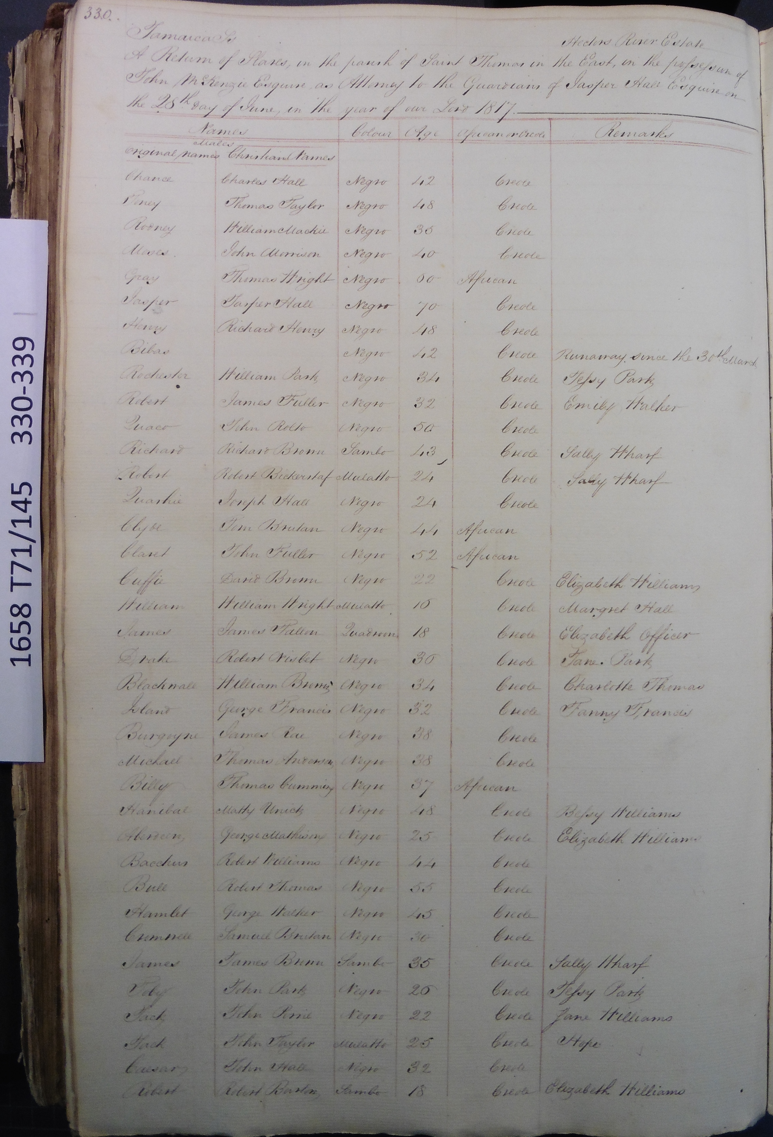 Slave register entry for Hectors River estate in 1817, page 1 of 10. T71/145 pp. 330-339. © Images reproduced by permission of The National Archives, London, England. The National Archives give no warranty as to the accuracy, completeness or fitness for the purpose of the information provided. Images may be used only for purposes of research, private study or education. Applications for any other use should be made to The National Archives, Kew, Richmond, Surrey TW9 4DU, Tel: 020 8392 5225 Fax: 020 8392 5266.