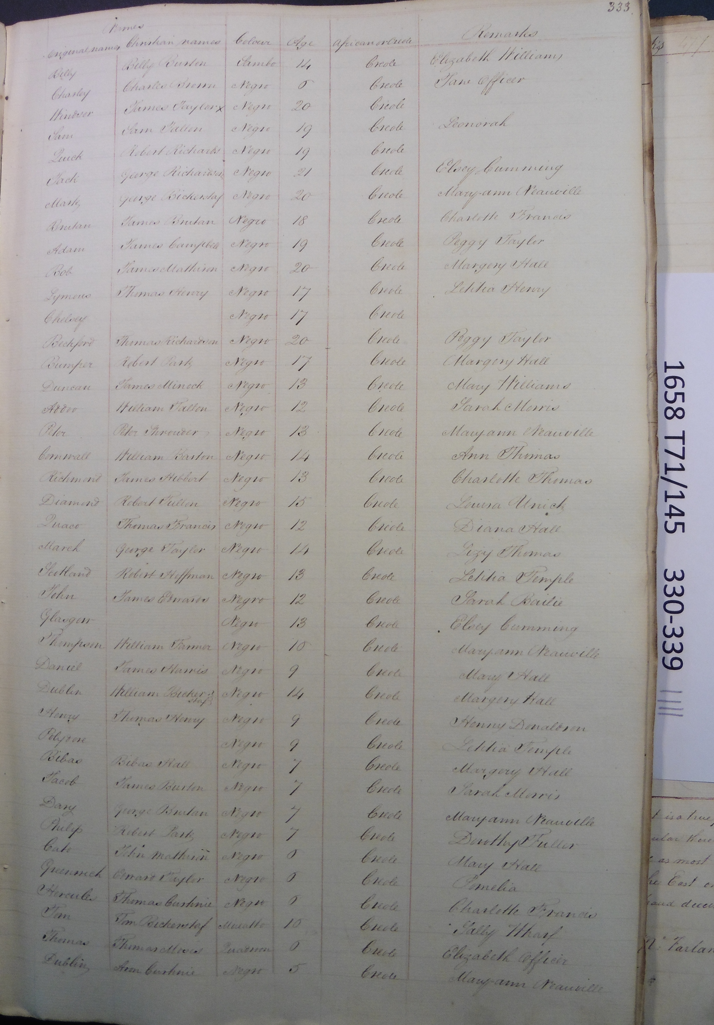 Slave register entry for Hectors River estate in 1817, page 4 of 10. T71/145 pp. 330-339. © Images reproduced by permission of The National Archives, London, England. The National Archives give no warranty as to the accuracy, completeness or fitness for the purpose of the information provided. Images may be used only for purposes of research, private study or education. Applications for any other use should be made to The National Archives, Kew, Richmond, Surrey TW9 4DU, Tel: 020 8392 5225 Fax: 020 8392 5266.