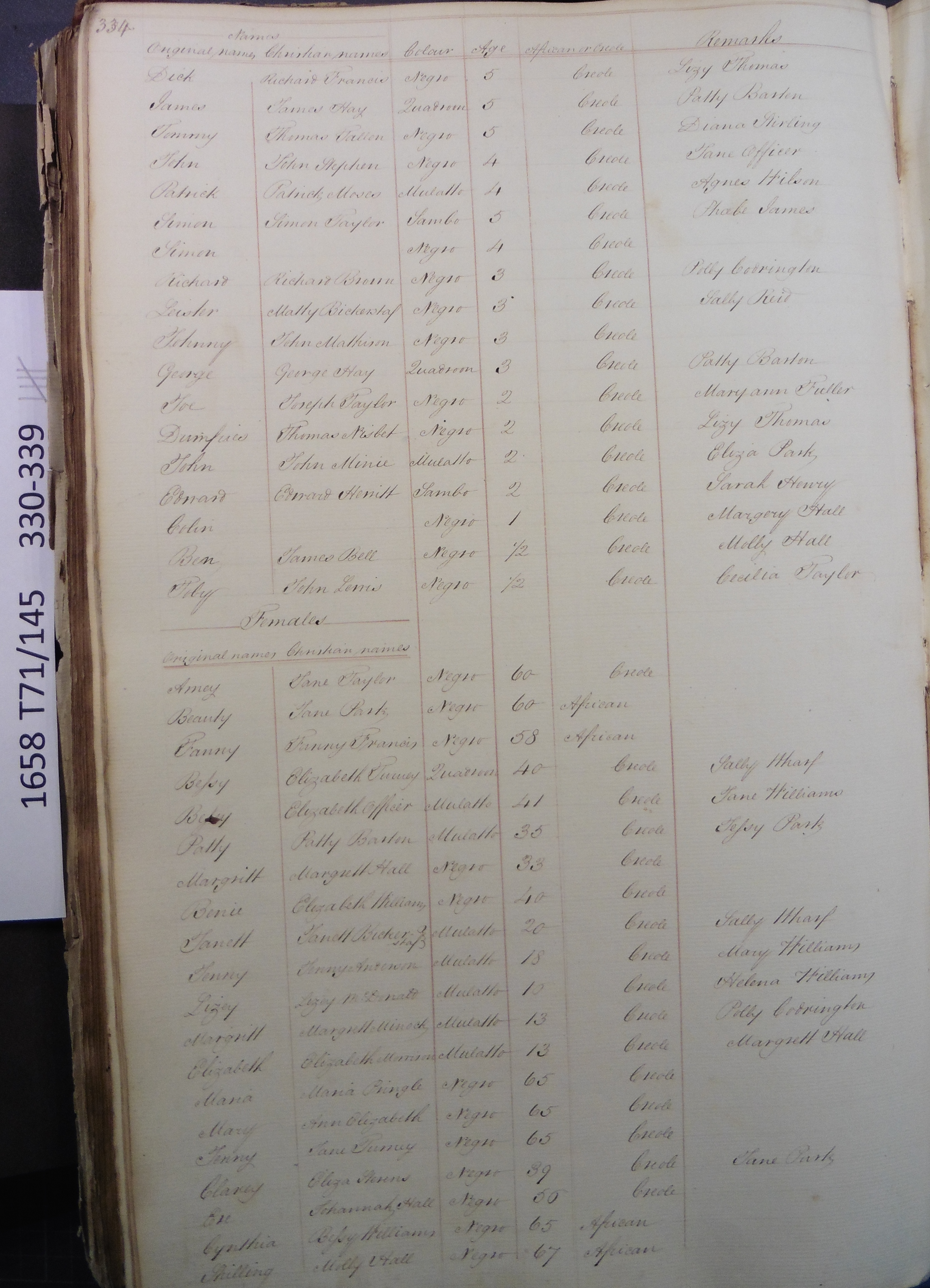 Slave register entry for Hectors River estate in 1817, page 5 of 10. T71/145 pp. 330-339. © Images reproduced by permission of The National Archives, London, England. The National Archives give no warranty as to the accuracy, completeness or fitness for the purpose of the information provided. Images may be used only for purposes of research, private study or education. Applications for any other use should be made to The National Archives, Kew, Richmond, Surrey TW9 4DU, Tel: 020 8392 5225 Fax: 020 8392 5266.