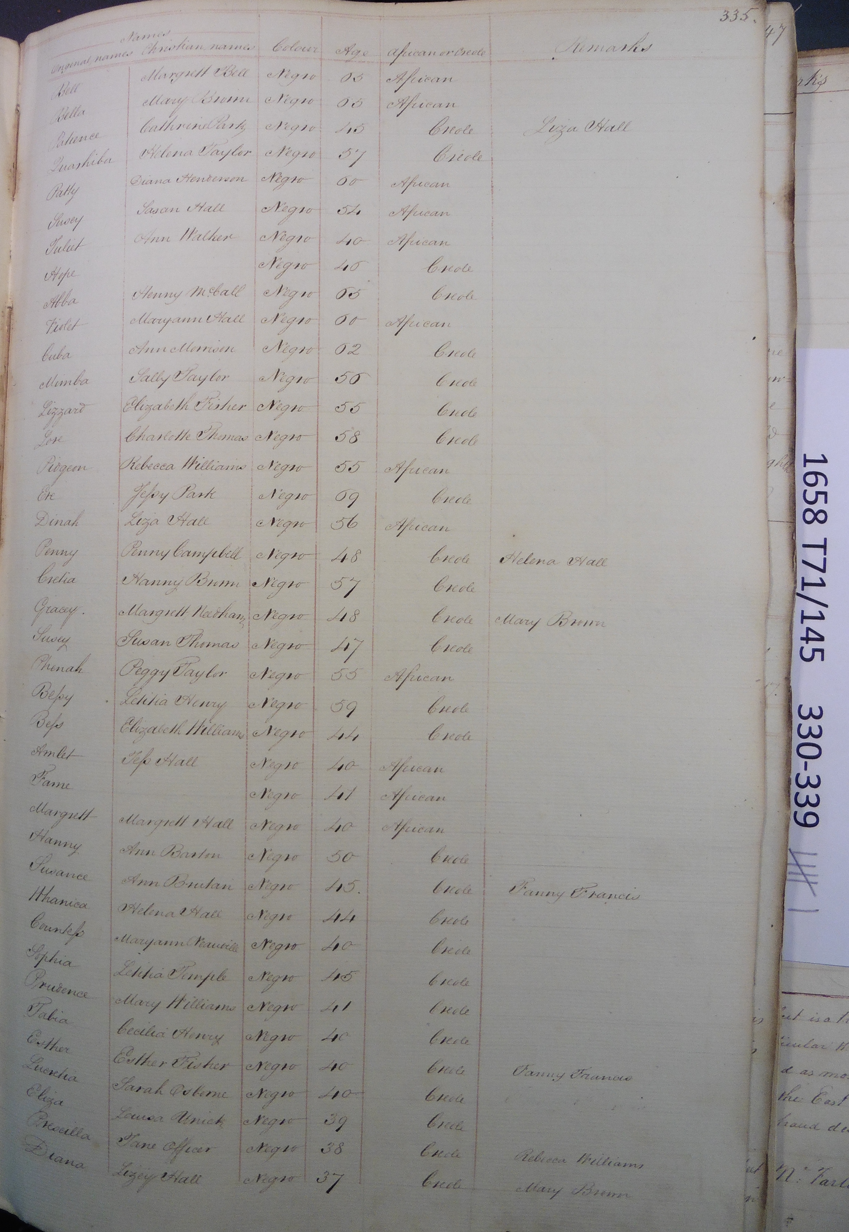 Slave register entry for Hectors River estate in 1817, page 6 of 10. T71/145 pp. 330-339. © Images reproduced by permission of The National Archives, London, England. The National Archives give no warranty as to the accuracy, completeness or fitness for the purpose of the information provided. Images may be used only for purposes of research, private study or education. Applications for any other use should be made to The National Archives, Kew, Richmond, Surrey TW9 4DU, Tel: 020 8392 5225 Fax: 020 8392 5266.