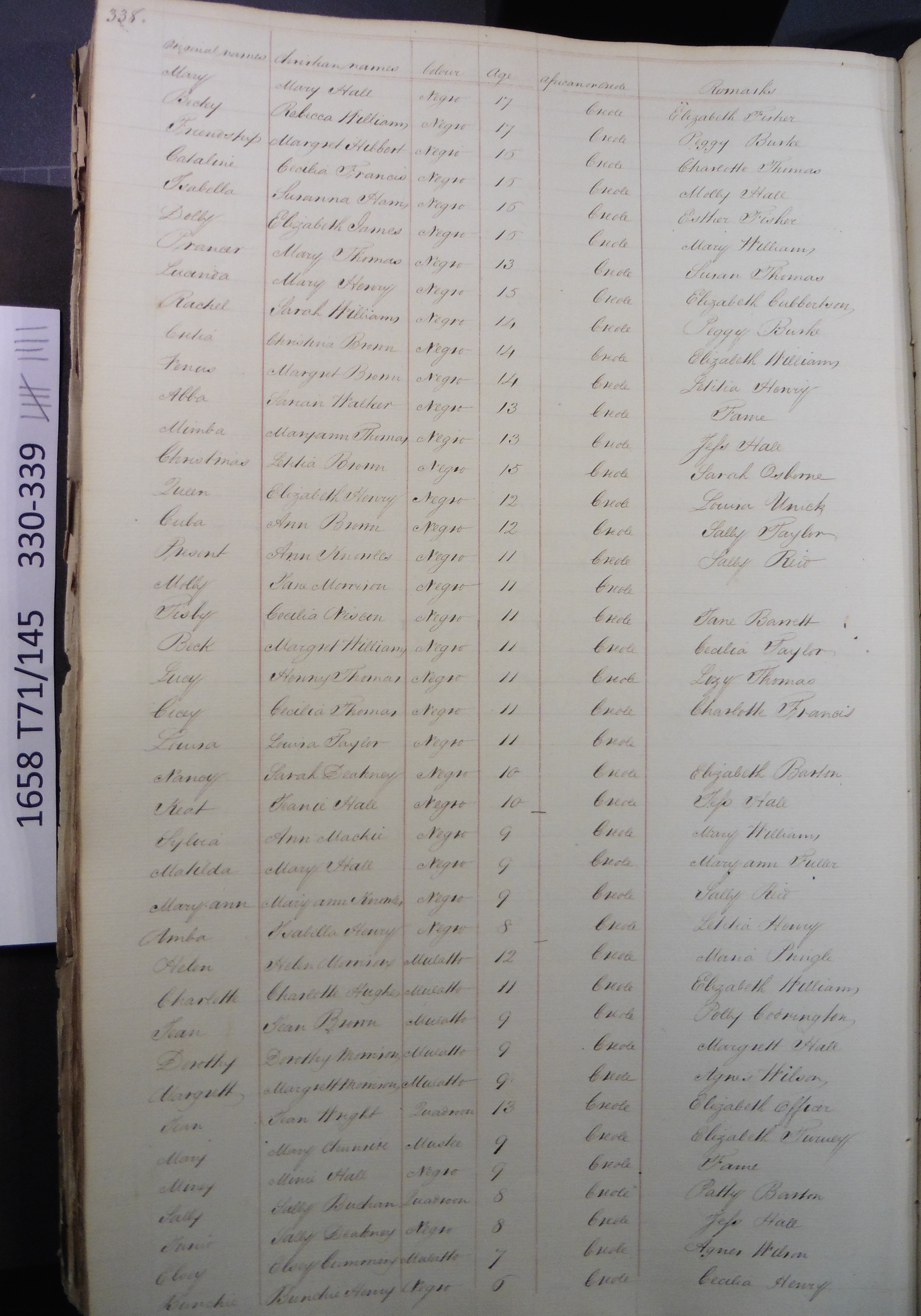 Slave register entry for Hectors River estate in 1817, page 9 of 10. T71/145 pp. 330-339. © Images reproduced by permission of The National Archives, London, England. The National Archives give no warranty as to the accuracy, completeness or fitness for the purpose of the information provided. Images may be used only for purposes of research, private study or education. Applications for any other use should be made to The National Archives, Kew, Richmond, Surrey TW9 4DU, Tel: 020 8392 5225 Fax: 020 8392 5266.