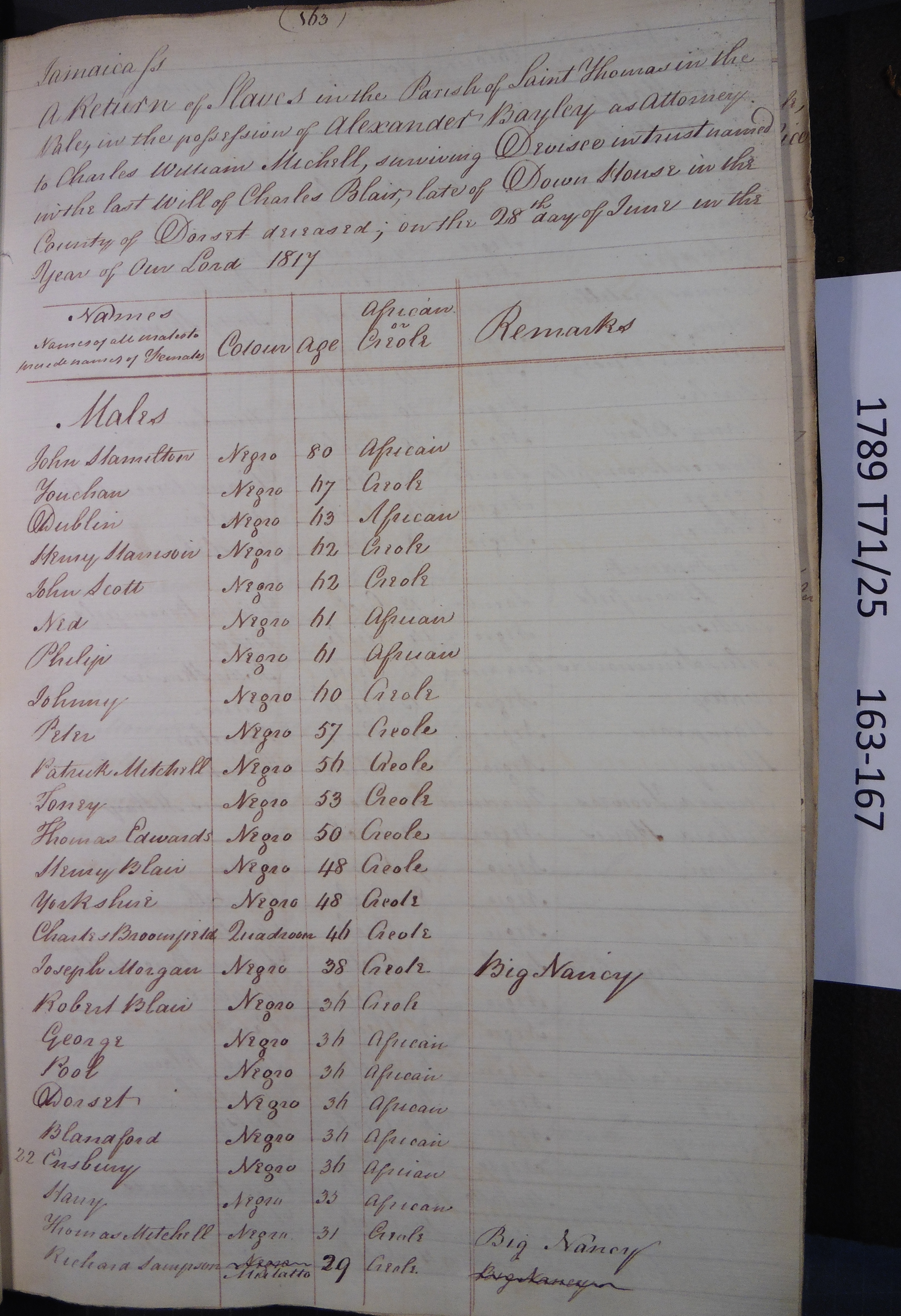 Slave register entry for West Prospect estate in 1817, page 1 of 5. T71/25 pp. 163-167. © Images reproduced by permission of The National Archives, London, England. The National Archives give no warranty as to the accuracy, completeness or fitness for the purpose of the information provided. Images may be used only for purposes of research, private study or education. Applications for any other use should be made to The National Archives, Kew, Richmond, Surrey TW9 4DU, Tel: 020 8392 5225 Fax: 020 8392 5266.