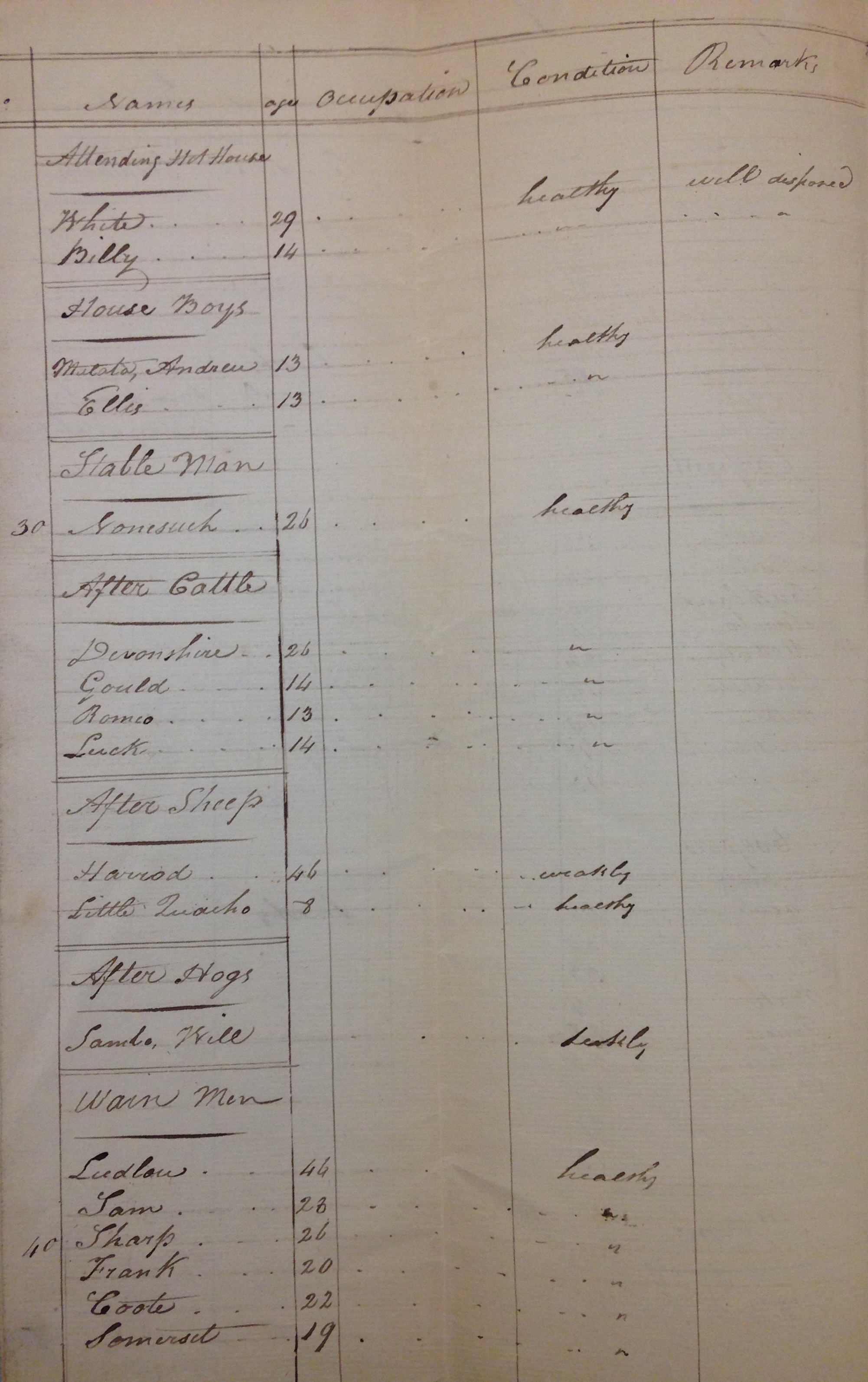 A list of enslaved people on Hope estate in 1813 with details of ages, parentage, occupation and general health, page 2 of 13. Source: 'A General List of Negroes on Hope Estate, 1st January 1813', Stowe Papers, West Indies Box 1, folder 12, The Huntington Library, San Marino, California.