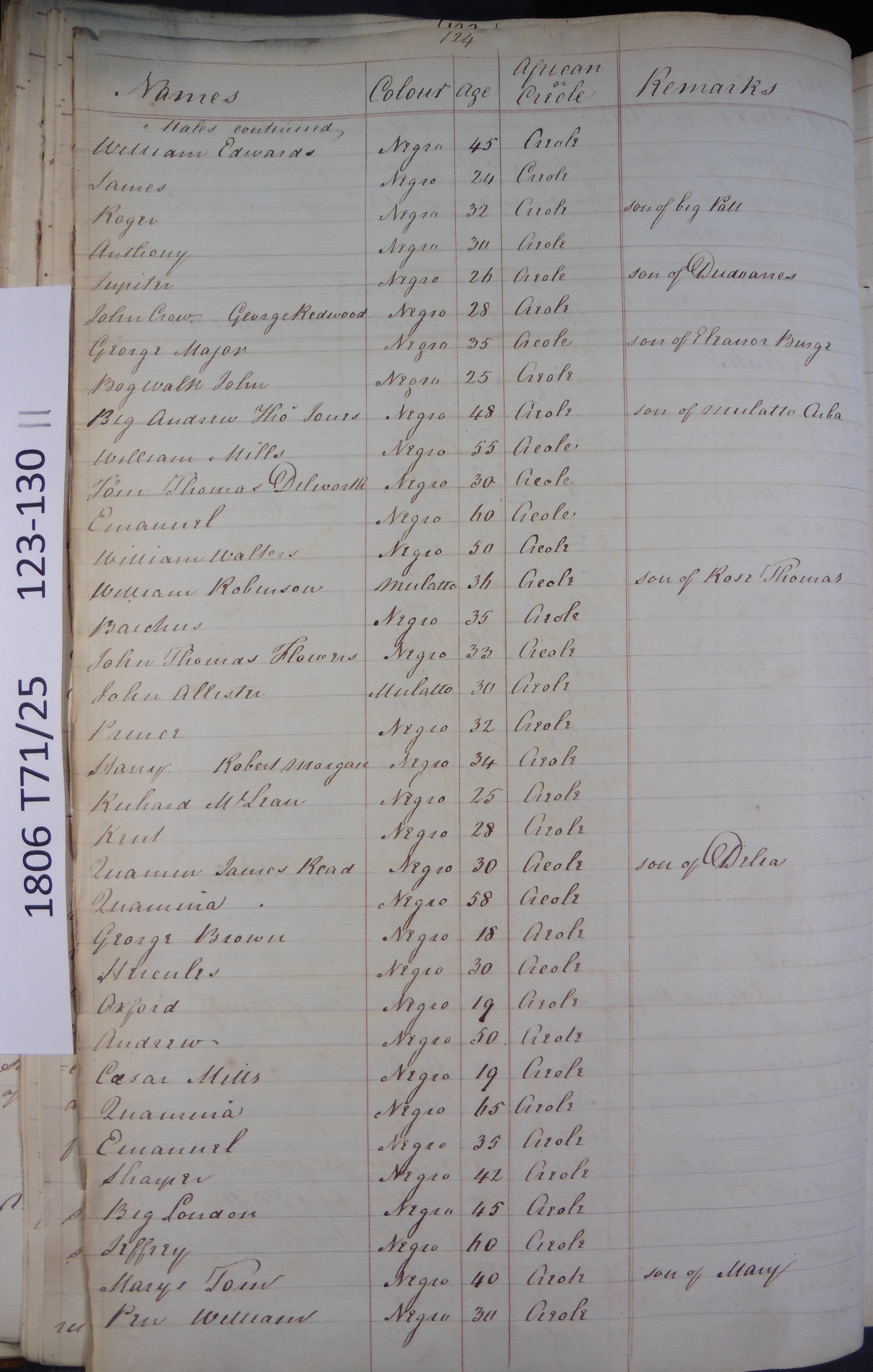 Slave register entry for Palm estate in 1817, page 2 of 8. T71/25 pp. 123-130. © Images reproduced by permission of The National Archives, London, England. The National Archives give no warranty as to the accuracy, completeness or fitness for the purpose of the information provided. Images may be used only for purposes of research, private study or education. Applications for any other use should be made to The National Archives, Kew, Richmond, Surrey TW9 4DU, Tel: 020 8392 5225 Fax: 020 8392 5266.