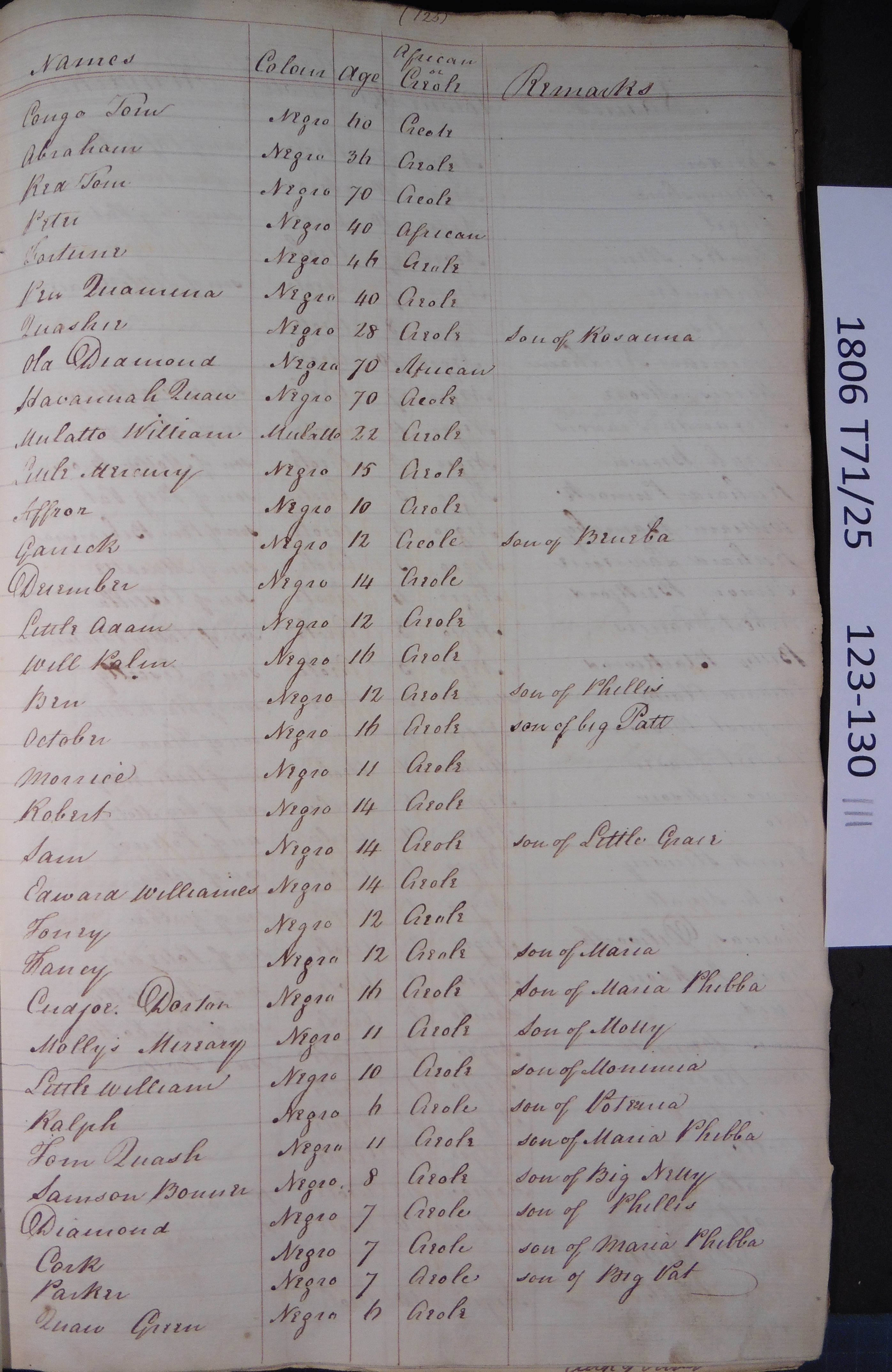 Slave register entry for Palm estate in 1817, page 3 of 8. T71/25 pp. 123-130. © Images reproduced by permission of The National Archives, London, England. The National Archives give no warranty as to the accuracy, completeness or fitness for the purpose of the information provided. Images may be used only for purposes of research, private study or education. Applications for any other use should be made to The National Archives, Kew, Richmond, Surrey TW9 4DU, Tel: 020 8392 5225 Fax: 020 8392 5266.