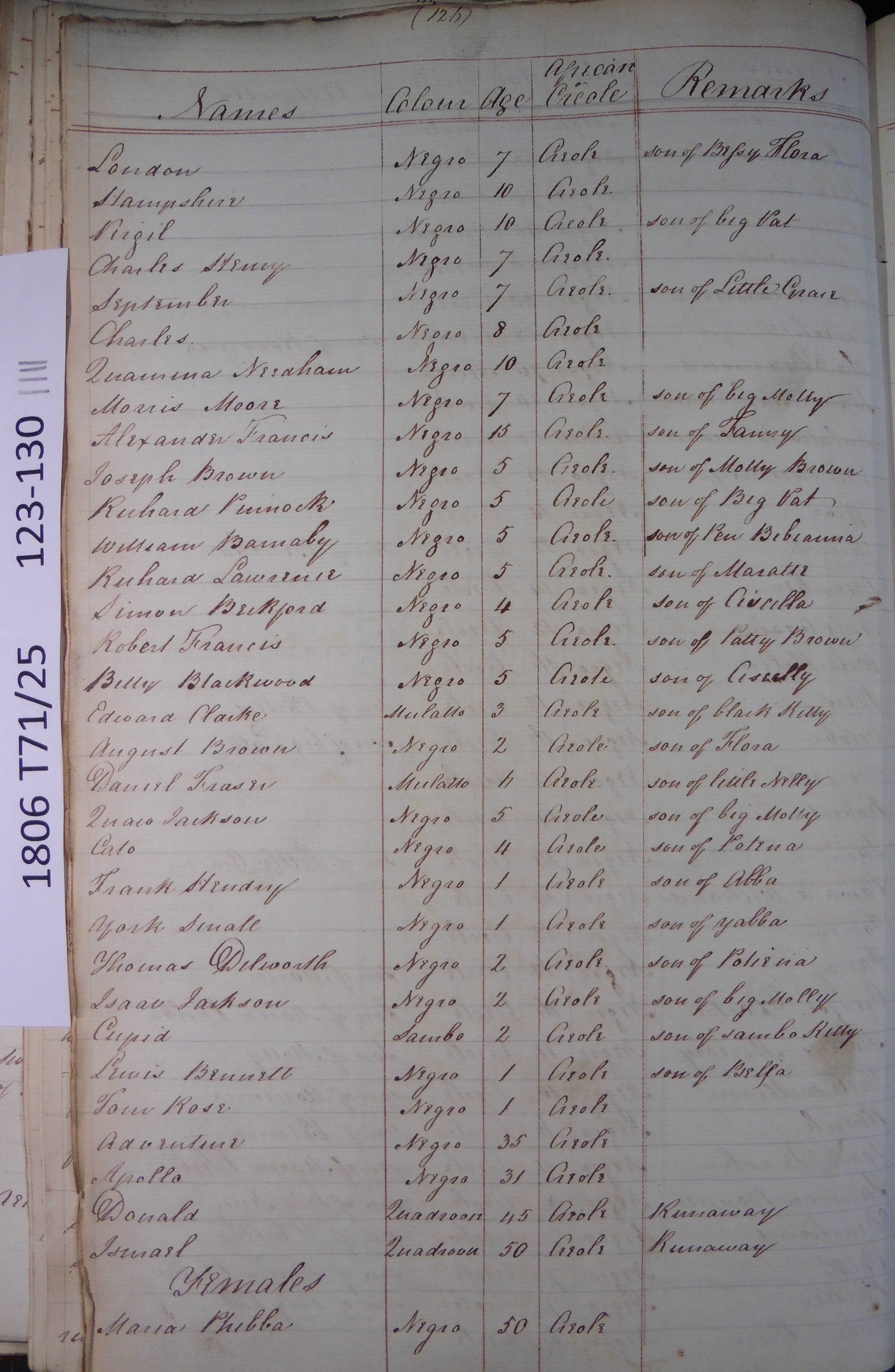 Slave register entry for Palm estate in 1817, page 4 of 8. T71/25 pp. 123-130. © Images reproduced by permission of The National Archives, London, England. The National Archives give no warranty as to the accuracy, completeness or fitness for the purpose of the information provided. Images may be used only for purposes of research, private study or education. Applications for any other use should be made to The National Archives, Kew, Richmond, Surrey TW9 4DU, Tel: 020 8392 5225 Fax: 020 8392 5266.