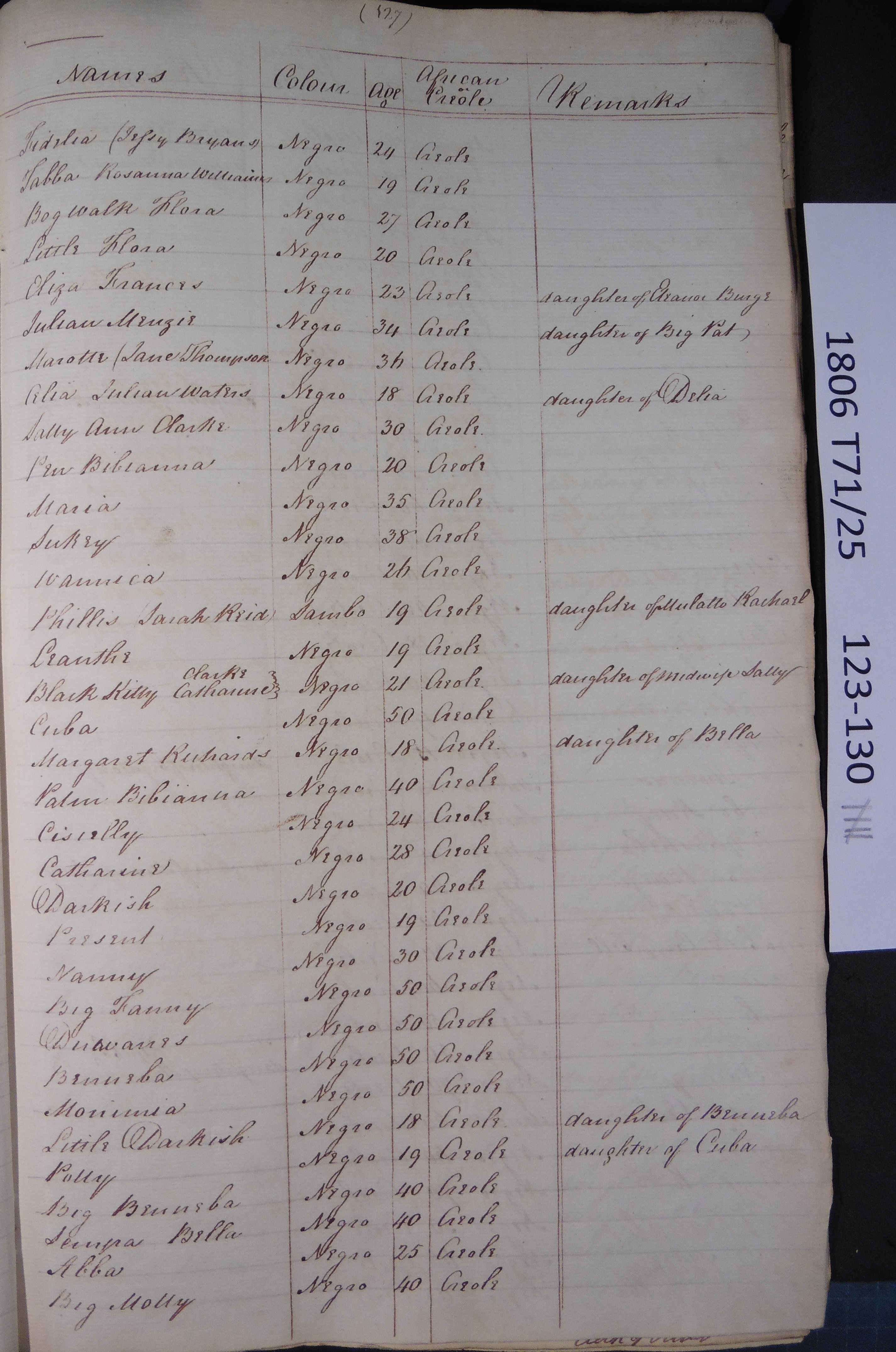 Slave register entry for Palm estate in 1817, page 5 of 8. T71/25 pp. 123-130. © Images reproduced by permission of The National Archives, London, England. The National Archives give no warranty as to the accuracy, completeness or fitness for the purpose of the information provided. Images may be used only for purposes of research, private study or education. Applications for any other use should be made to The National Archives, Kew, Richmond, Surrey TW9 4DU, Tel: 020 8392 5225 Fax: 020 8392 5266.