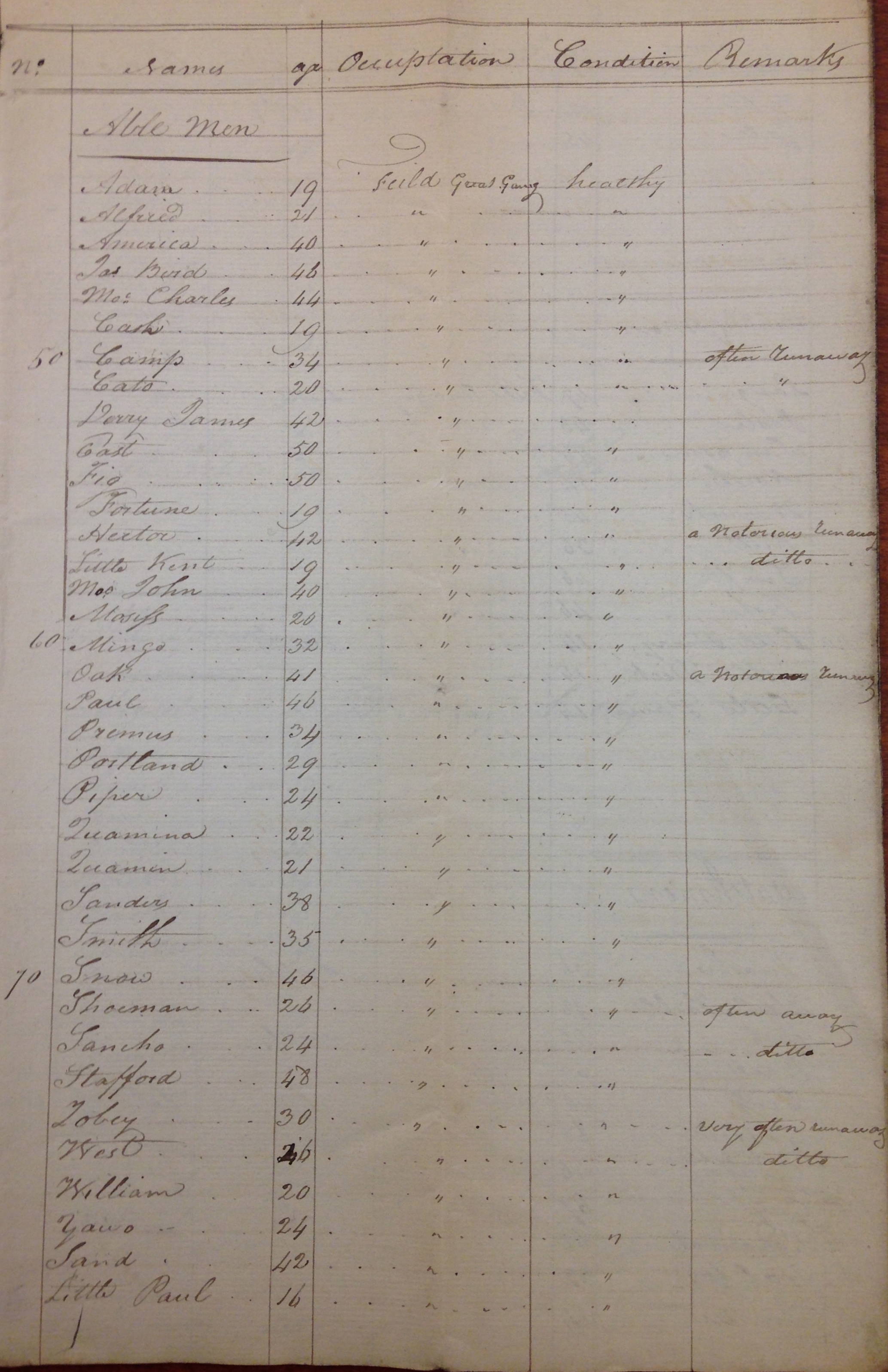 A list of enslaved people on Hope estate in 1813 with details of ages, parentage, occupation and general health, page 3 of 13. Source: 'A General List of Negroes on Hope Estate, 1st January 1813', Stowe Papers, West Indies Box 1, folder 12, The Huntington Library, San Marino, California.