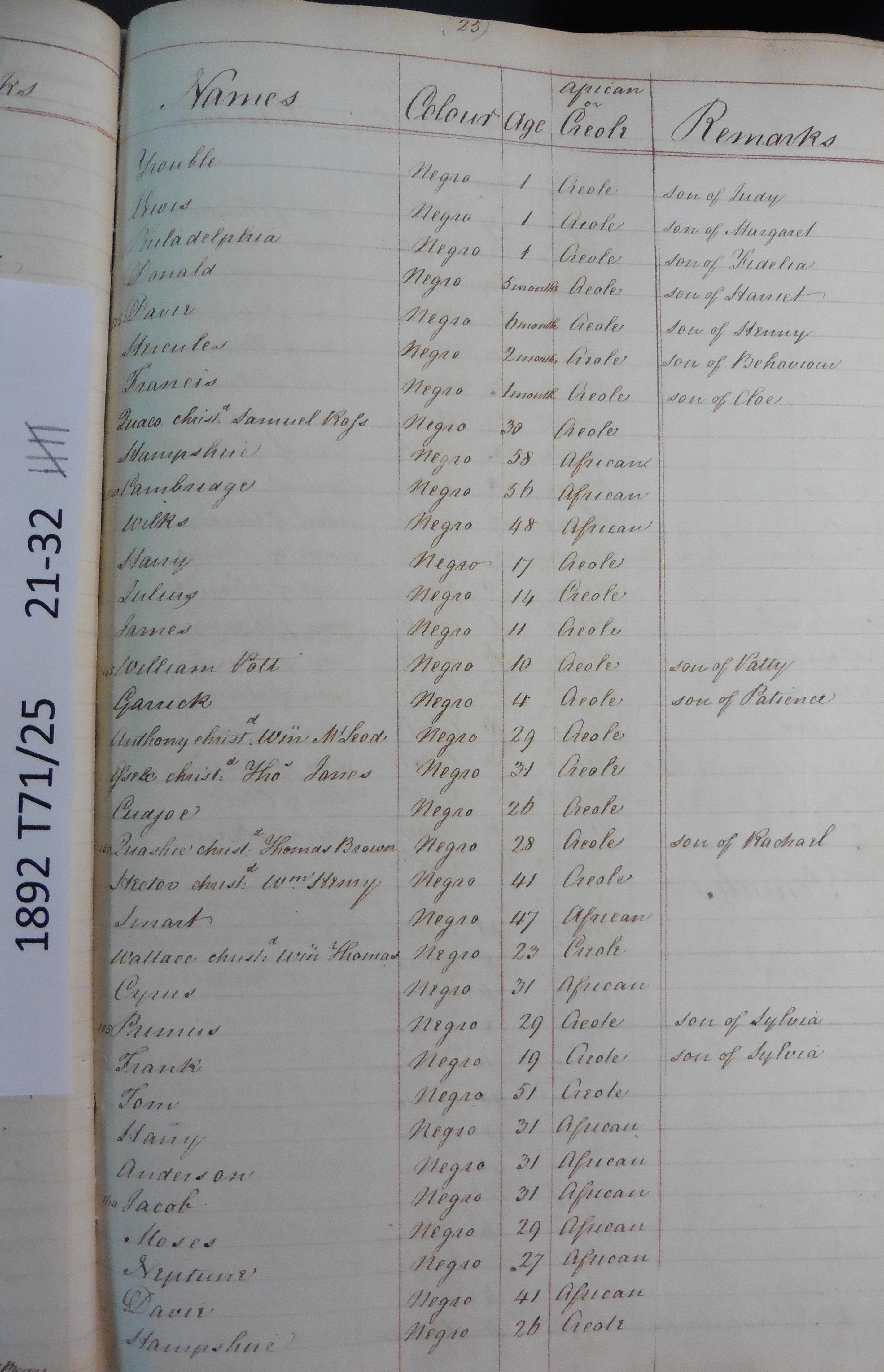 Slave register entry for Bybrook estate in 1817, page 5 of 12. T71/25 pp. 21-32. © Images reproduced by permission of The National Archives, London, England. The National Archives give no warranty as to the accuracy, completeness or fitness for the purpose of the information provided. Images may be used only for purposes of research, private study or education. Applications for any other use should be made to The National Archives, Kew, Richmond, Surrey TW9 4DU, Tel: 020 8392 5225 Fax: 020 8392 5266.