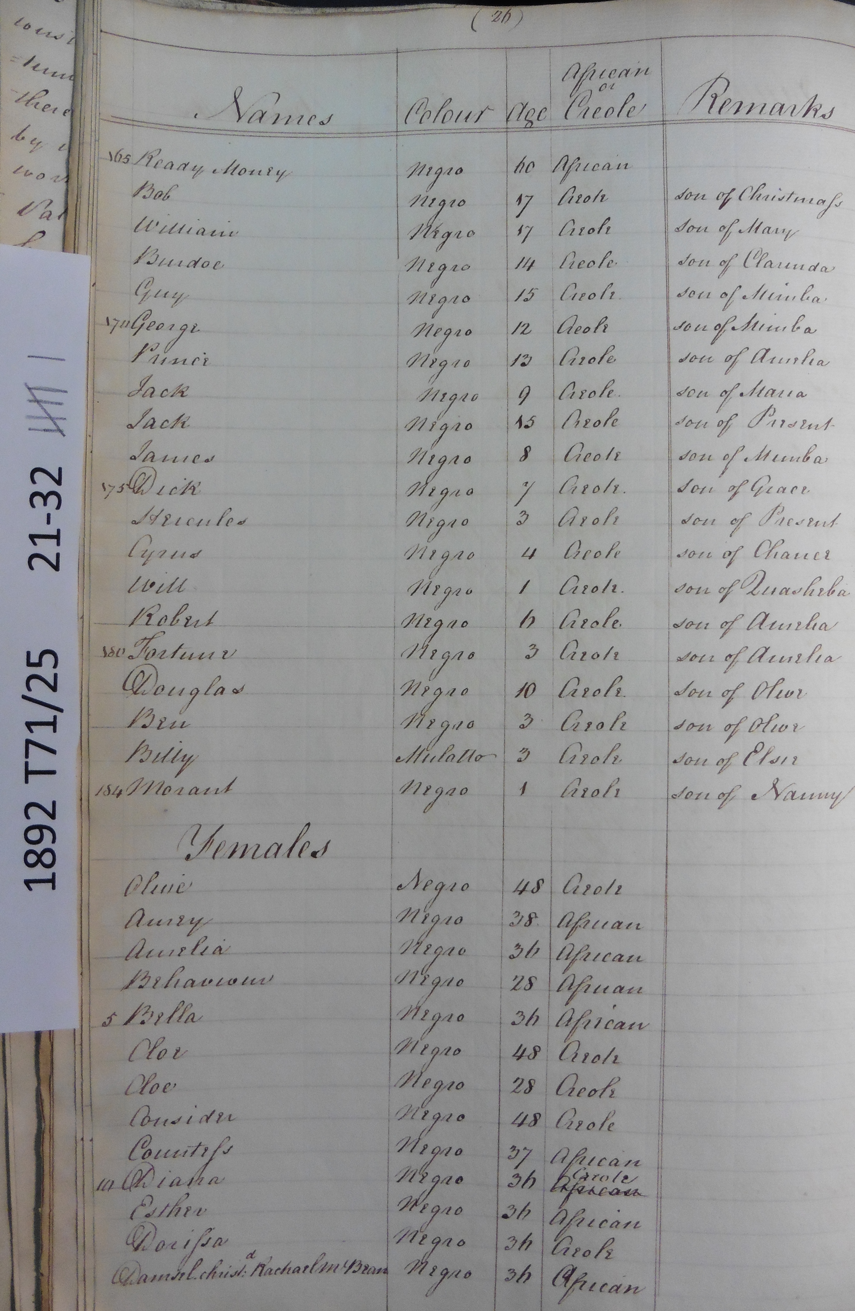 Slave register entry for Bybrook estate in 1817, page 6 of 12. T71/25 pp. 21-32. © Images reproduced by permission of The National Archives, London, England. The National Archives give no warranty as to the accuracy, completeness or fitness for the purpose of the information provided. Images may be used only for purposes of research, private study or education. Applications for any other use should be made to The National Archives, Kew, Richmond, Surrey TW9 4DU, Tel: 020 8392 5225 Fax: 020 8392 5266.