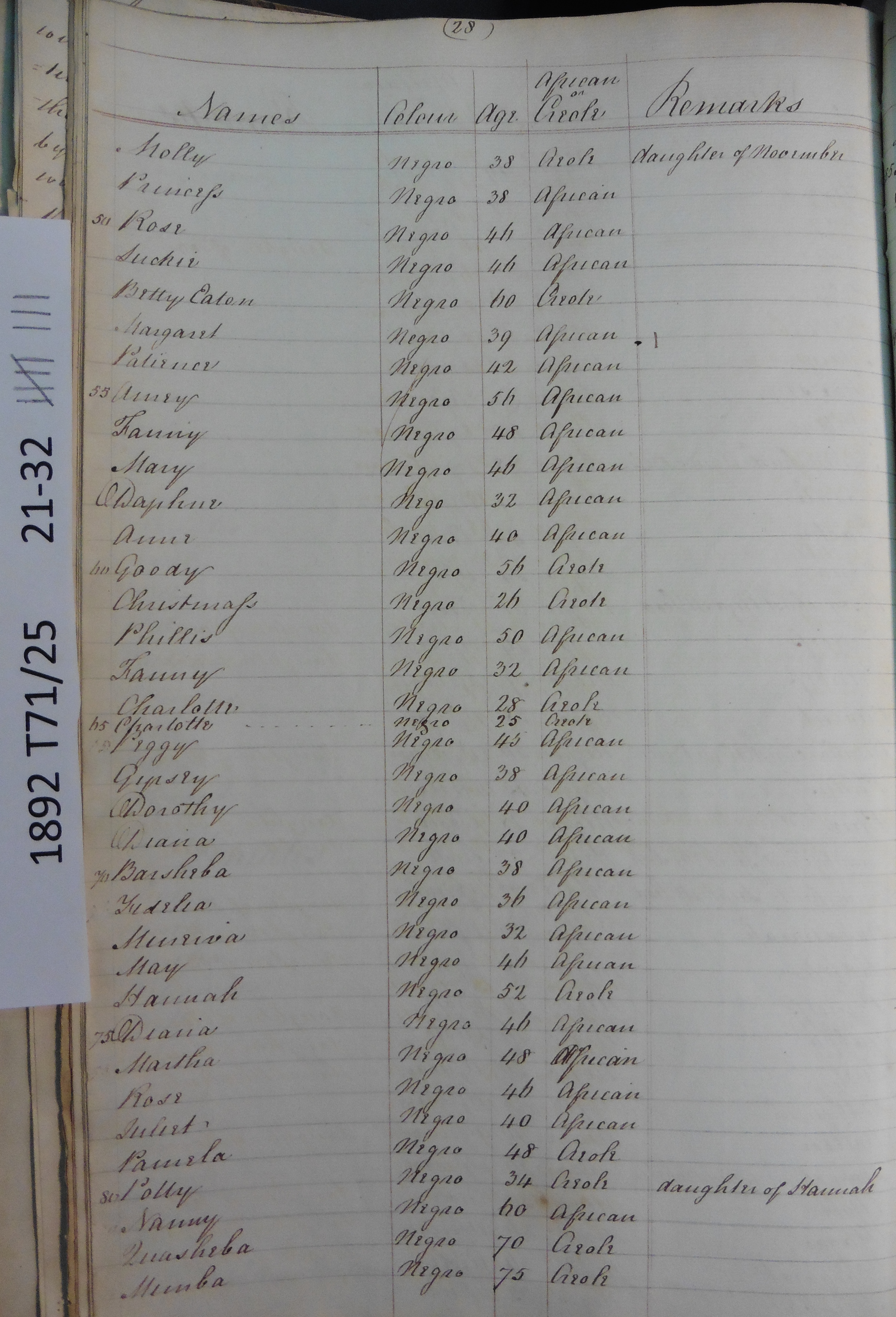 Slave register entry for Bybrook estate in 1817, page 8 of 12. T71/25 pp. 21-32. © Images reproduced by permission of The National Archives, London, England. The National Archives give no warranty as to the accuracy, completeness or fitness for the purpose of the information provided. Images may be used only for purposes of research, private study or education. Applications for any other use should be made to The National Archives, Kew, Richmond, Surrey TW9 4DU, Tel: 020 8392 5225 Fax: 020 8392 5266.