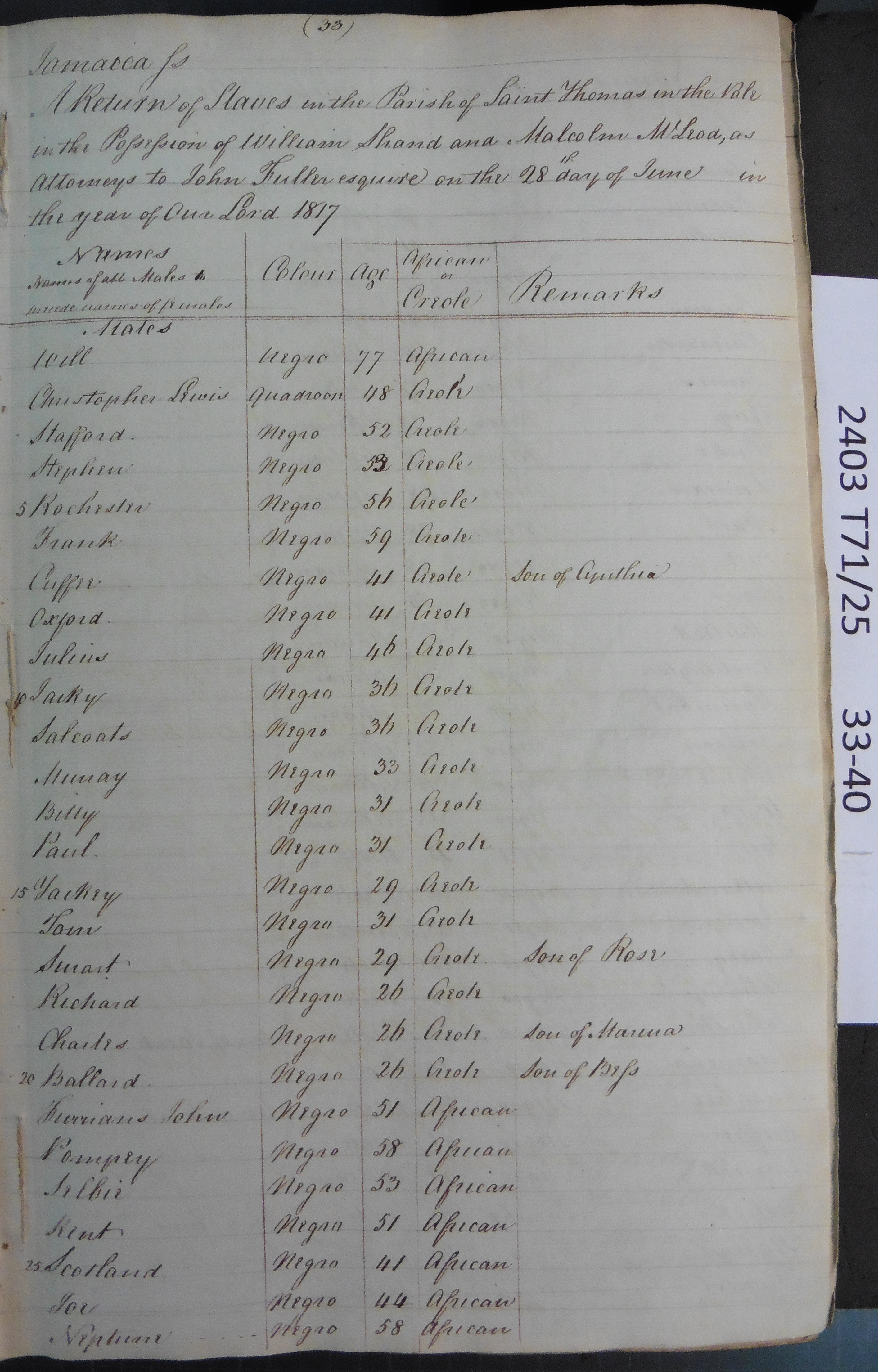 Slave register entry for Knollis estate in 1817, page 1 of 8. T71/25 pp. 33-40. © Images reproduced by permission of The National Archives, London, England. The National Archives give no warranty as to the accuracy, completeness or fitness for the purpose of the information provided. Images may be used only for purposes of research, private study or education. Applications for any other use should be made to The National Archives, Kew, Richmond, Surrey TW9 4DU, Tel: 020 8392 5225 Fax: 020 8392 5266.
