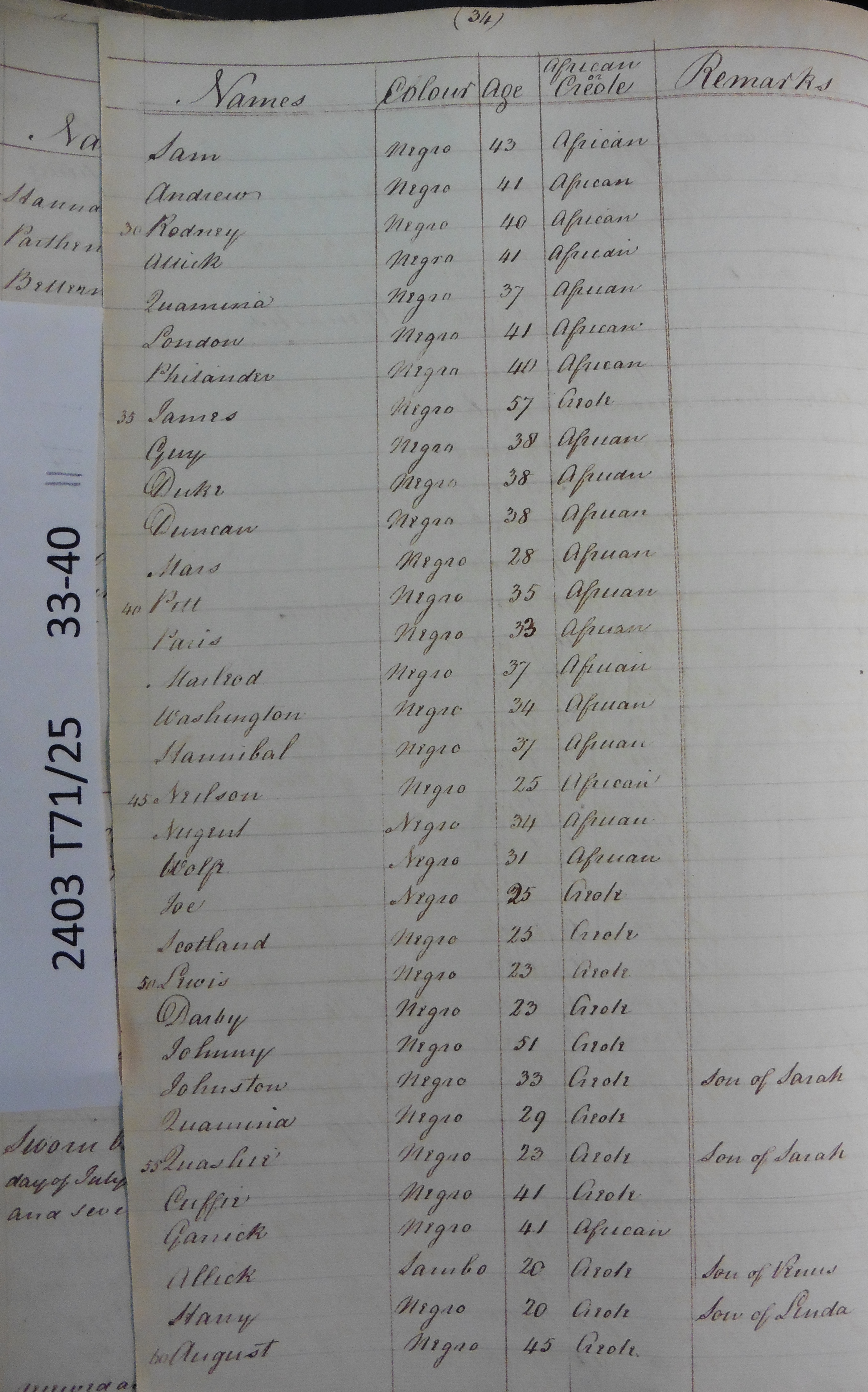 Slave register entry for Knollis estate in 1817, page 2 of 8. T71/25 pp. 33-40. © Images reproduced by permission of The National Archives, London, England. The National Archives give no warranty as to the accuracy, completeness or fitness for the purpose of the information provided. Images may be used only for purposes of research, private study or education. Applications for any other use should be made to The National Archives, Kew, Richmond, Surrey TW9 4DU, Tel: 020 8392 5225 Fax: 020 8392 5266.