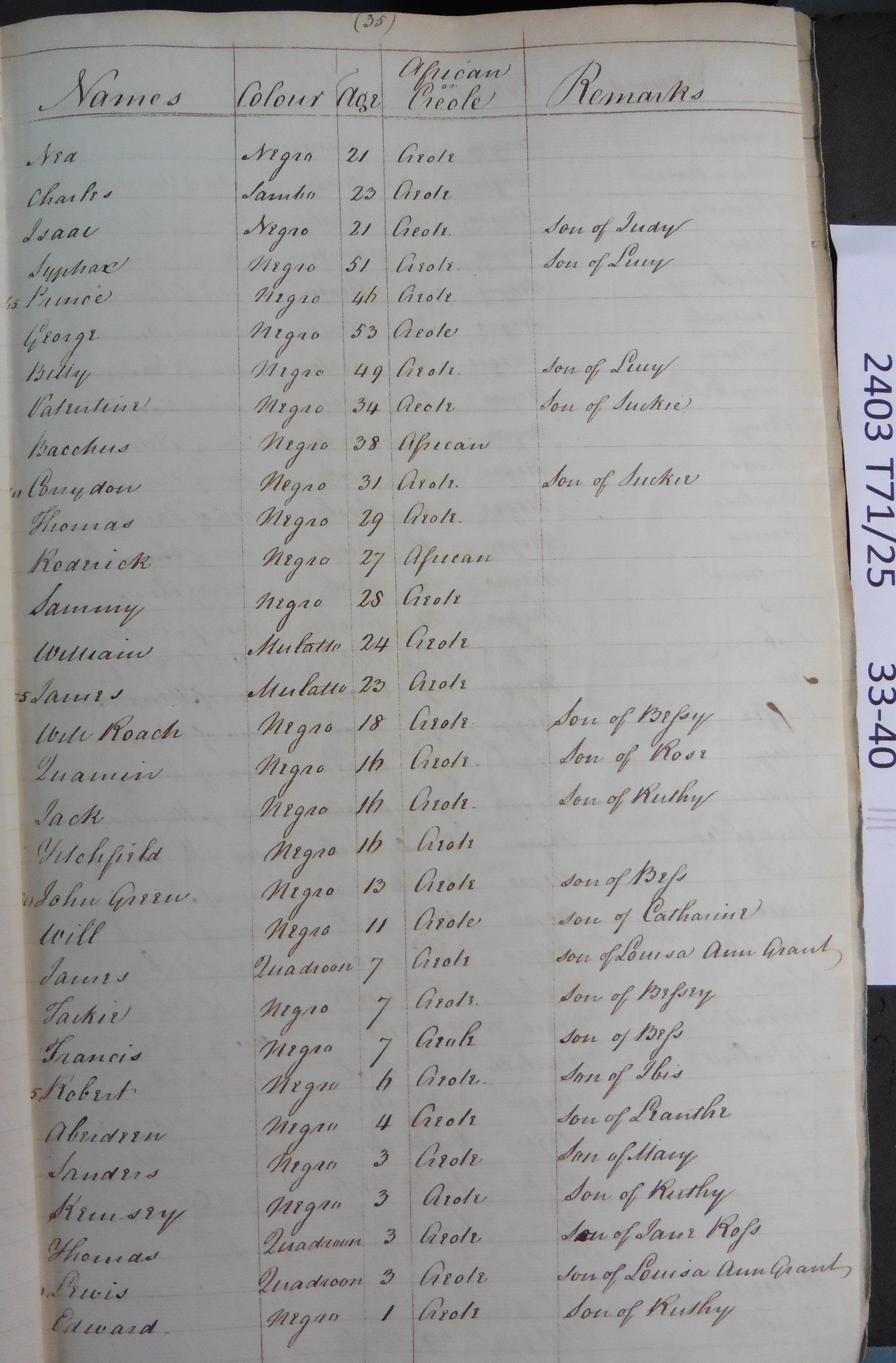 Slave register entry for Knollis estate in 1817, page 3 of 8. T71/25 pp. 33-40. © Images reproduced by permission of The National Archives, London, England. The National Archives give no warranty as to the accuracy, completeness or fitness for the purpose of the information provided. Images may be used only for purposes of research, private study or education. Applications for any other use should be made to The National Archives, Kew, Richmond, Surrey TW9 4DU, Tel: 020 8392 5225 Fax: 020 8392 5266.