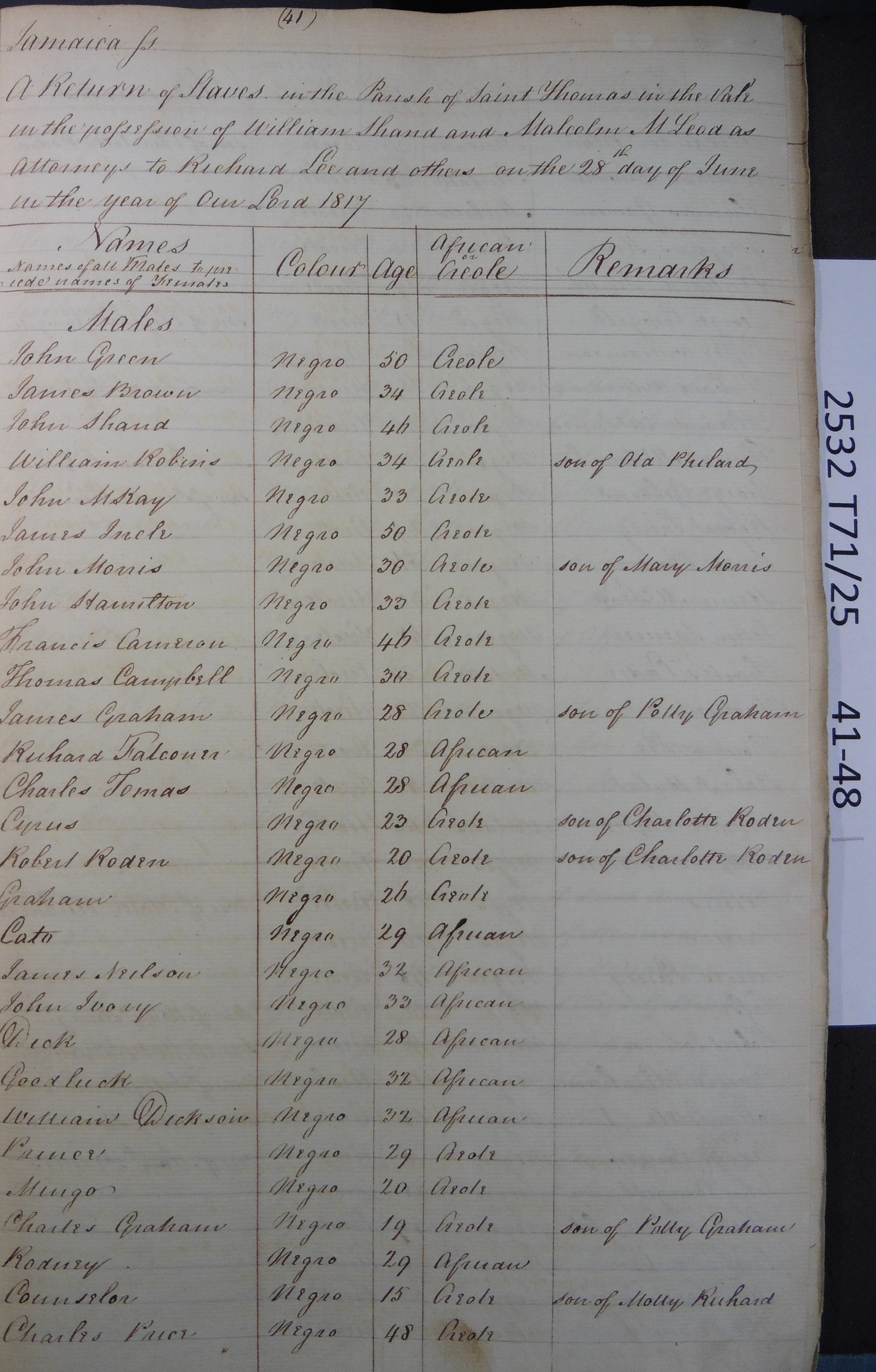 Slave register entry for Rose Hall estate in 1817, page 1 of 8. T71/25 pp. 41-48. © Images reproduced by permission of The National Archives, London, England. The National Archives give no warranty as to the accuracy, completeness or fitness for the purpose of the information provided. Images may be used only for purposes of research, private study or education. Applications for any other use should be made to The National Archives, Kew, Richmond, Surrey TW9 4DU, Tel: 020 8392 5225 Fax: 020 8392 5266.