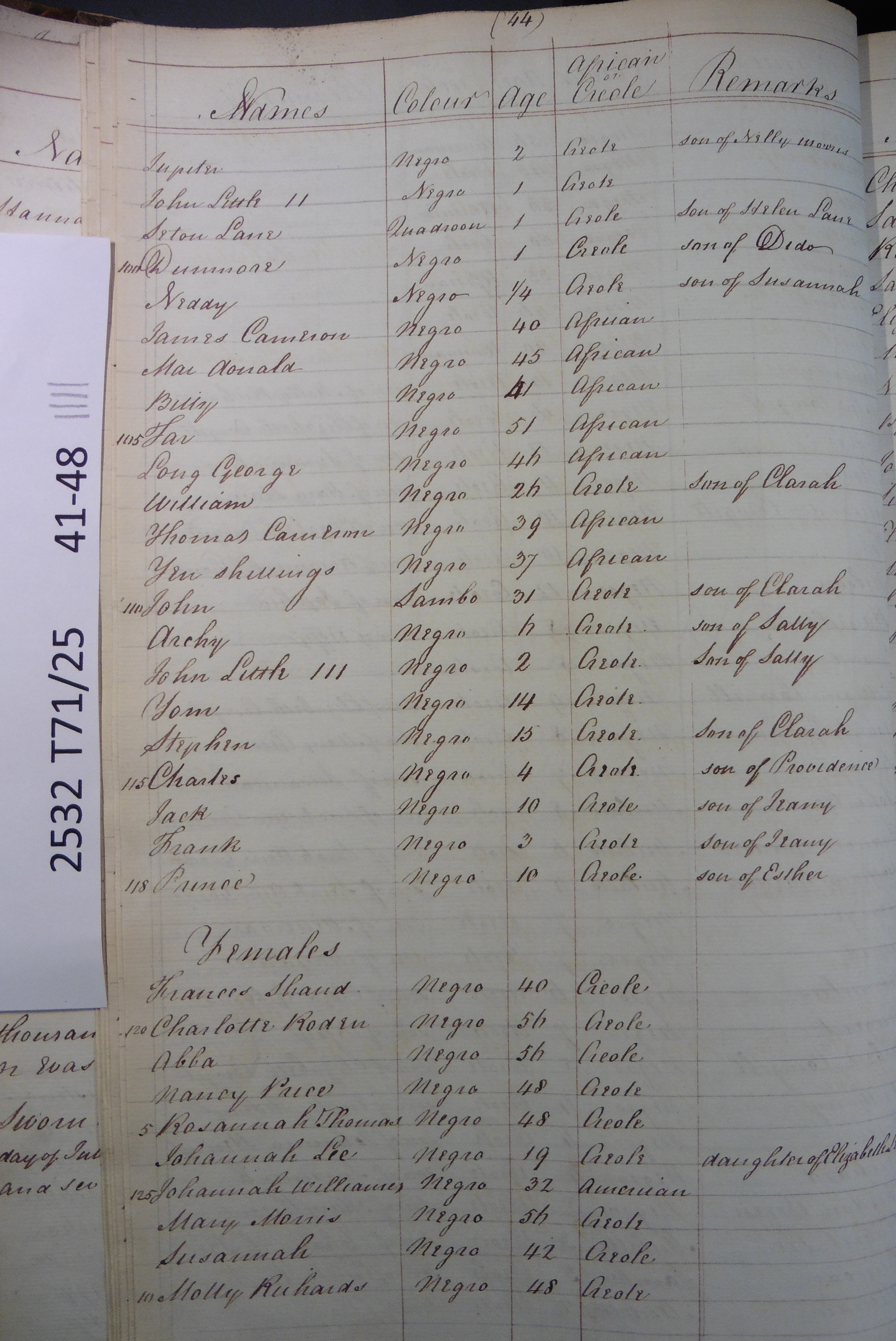Slave register entry for Rose Hall estate in 1817, page 4 of 8. T71/25 pp. 41-48. © Images reproduced by permission of The National Archives, London, England. The National Archives give no warranty as to the accuracy, completeness or fitness for the purpose of the information provided. Images may be used only for purposes of research, private study or education. Applications for any other use should be made to The National Archives, Kew, Richmond, Surrey TW9 4DU, Tel: 020 8392 5225 Fax: 020 8392 5266.