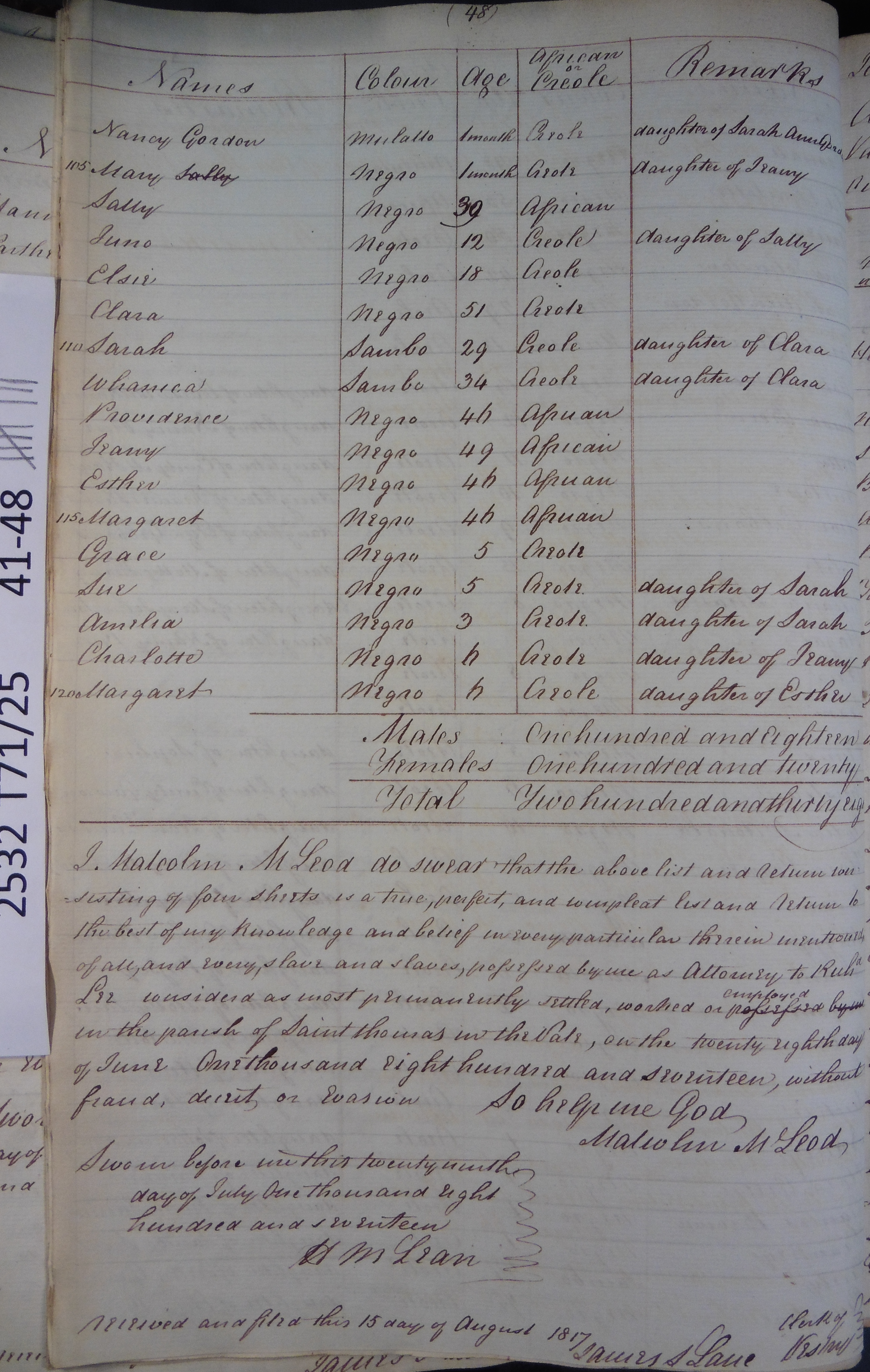 Slave register entry for Rose Hall estate in 1817, page 8 of 8. T71/25 pp. 41-48. © Images reproduced by permission of The National Archives, London, England. The National Archives give no warranty as to the accuracy, completeness or fitness for the purpose of the information provided. Images may be used only for purposes of research, private study or education. Applications for any other use should be made to The National Archives, Kew, Richmond, Surrey TW9 4DU, Tel: 020 8392 5225 Fax: 020 8392 5266.