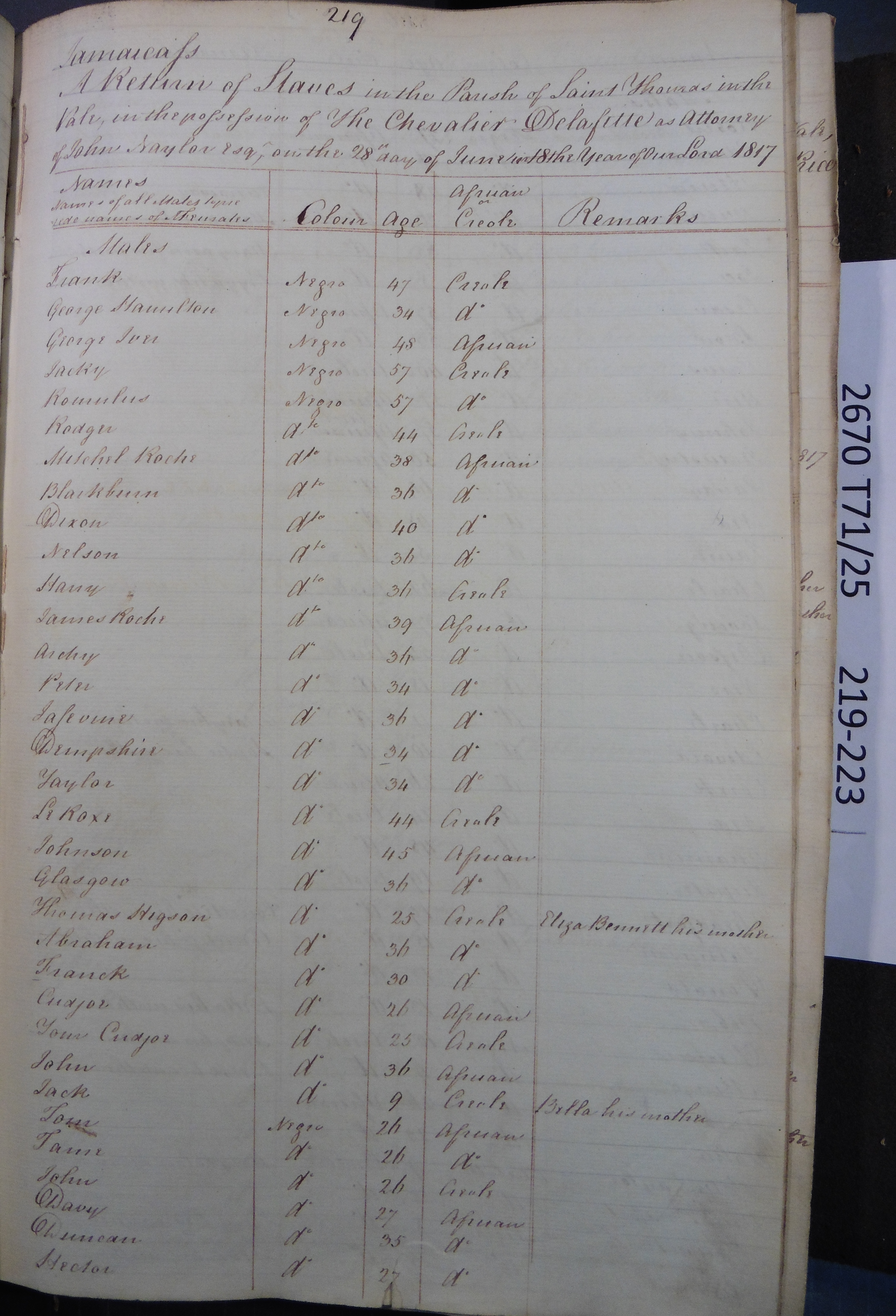 Slave register entry for Shenton estate in 1817, page 1 of 6. T71/25 pp. 219-224. © Images reproduced by permission of The National Archives, London, England. The National Archives give no warranty as to the accuracy, completeness or fitness for the purpose of the information provided. Images may be used only for purposes of research, private study or education. Applications for any other use should be made to The National Archives, Kew, Richmond, Surrey TW9 4DU, Tel: 020 8392 5225 Fax: 020 8392 5266.