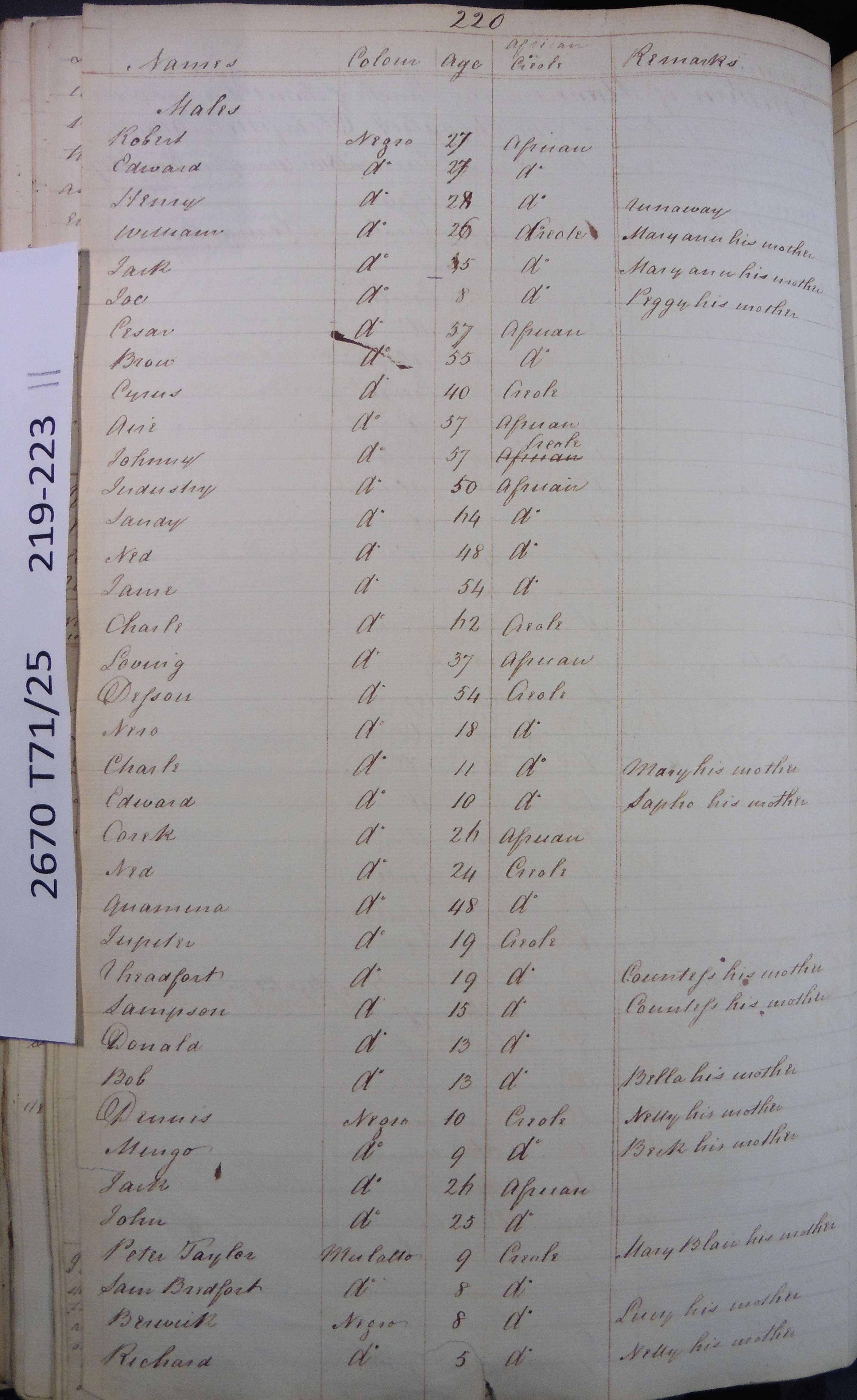 Slave register entry for Shenton estate in 1817, page 2 of 6. T71/25 pp. 219-224. © Images reproduced by permission of The National Archives, London, England. The National Archives give no warranty as to the accuracy, completeness or fitness for the purpose of the information provided. Images may be used only for purposes of research, private study or education. Applications for any other use should be made to The National Archives, Kew, Richmond, Surrey TW9 4DU, Tel: 020 8392 5225 Fax: 020 8392 5266.