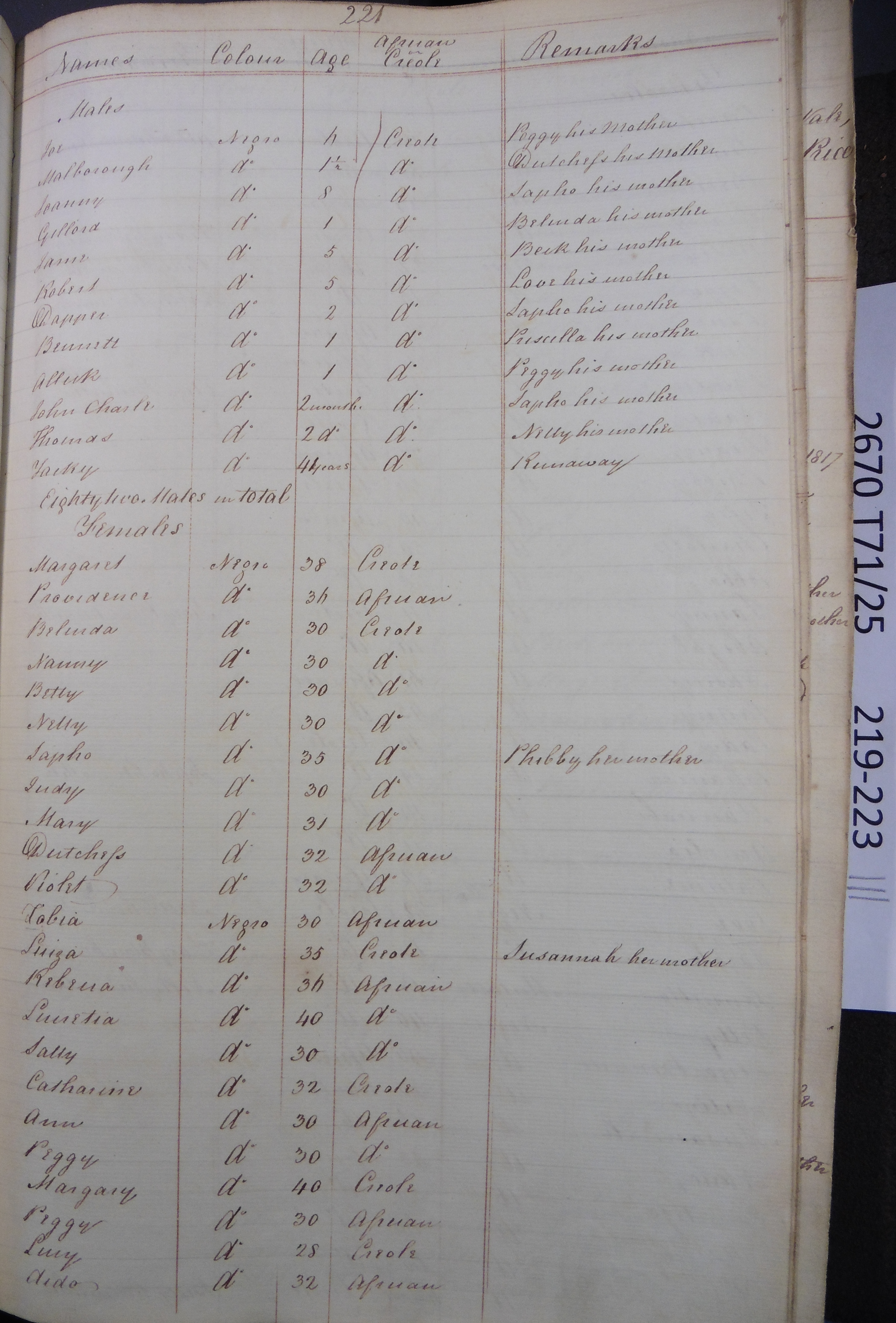 Slave register entry for Shenton estate in 1817, page 3 of 6. T71/25 pp. 219-224. © Images reproduced by permission of The National Archives, London, England. The National Archives give no warranty as to the accuracy, completeness or fitness for the purpose of the information provided. Images may be used only for purposes of research, private study or education. Applications for any other use should be made to The National Archives, Kew, Richmond, Surrey TW9 4DU, Tel: 020 8392 5225 Fax: 020 8392 5266.