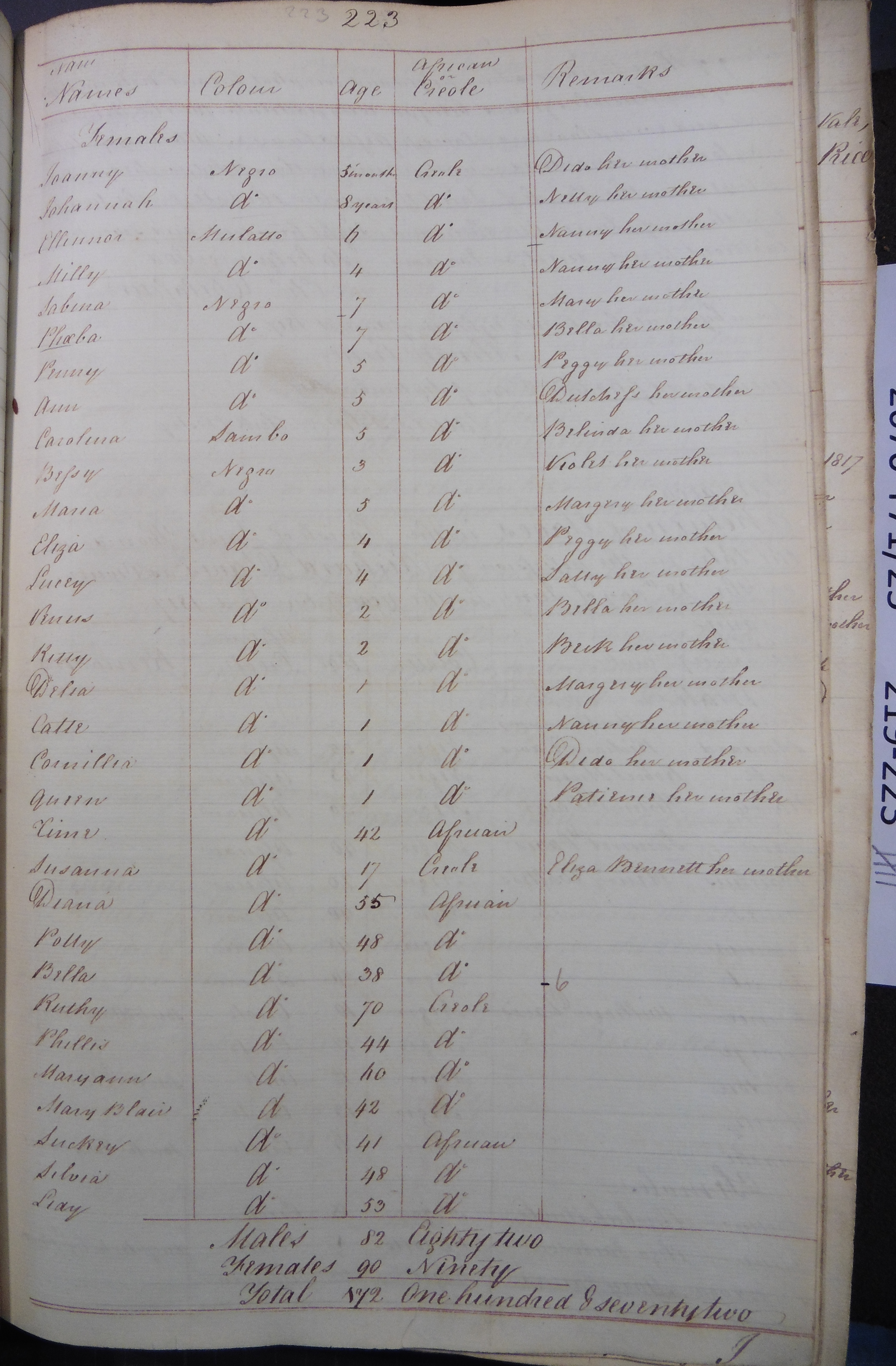 Slave register entry for Shenton estate in 1817, page 5 of 6. T71/25 pp. 219-224. © Images reproduced by permission of The National Archives, London, England. The National Archives give no warranty as to the accuracy, completeness or fitness for the purpose of the information provided. Images may be used only for purposes of research, private study or education. Applications for any other use should be made to The National Archives, Kew, Richmond, Surrey TW9 4DU, Tel: 020 8392 5225 Fax: 020 8392 5266.