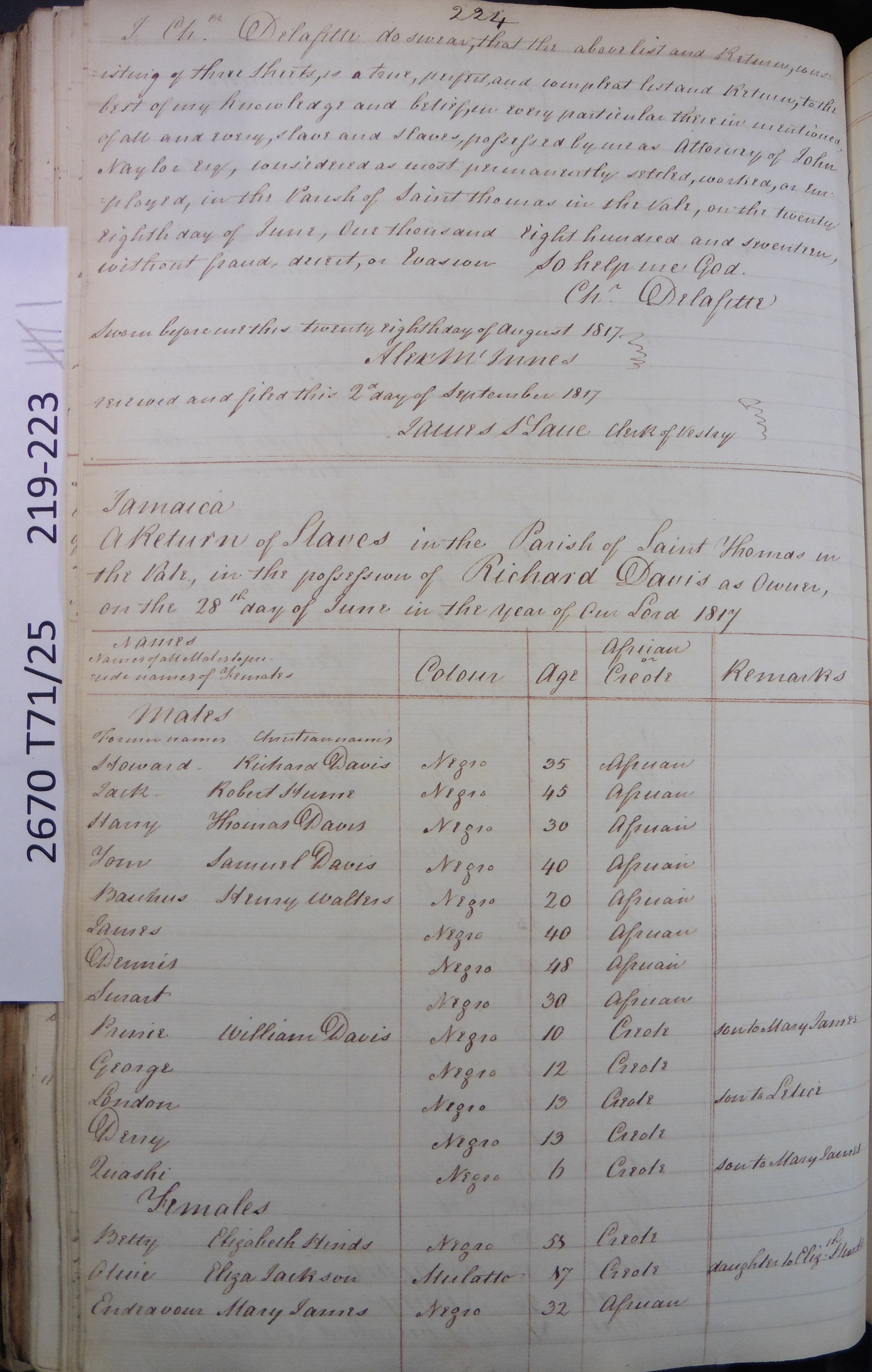 Slave register entry for Shenton estate in 1817, page 6 of 6. T71/25 pp. 219-224. © Images reproduced by permission of The National Archives, London, England. The National Archives give no warranty as to the accuracy, completeness or fitness for the purpose of the information provided. Images may be used only for purposes of research, private study or education. Applications for any other use should be made to The National Archives, Kew, Richmond, Surrey TW9 4DU, Tel: 020 8392 5225 Fax: 020 8392 5266.