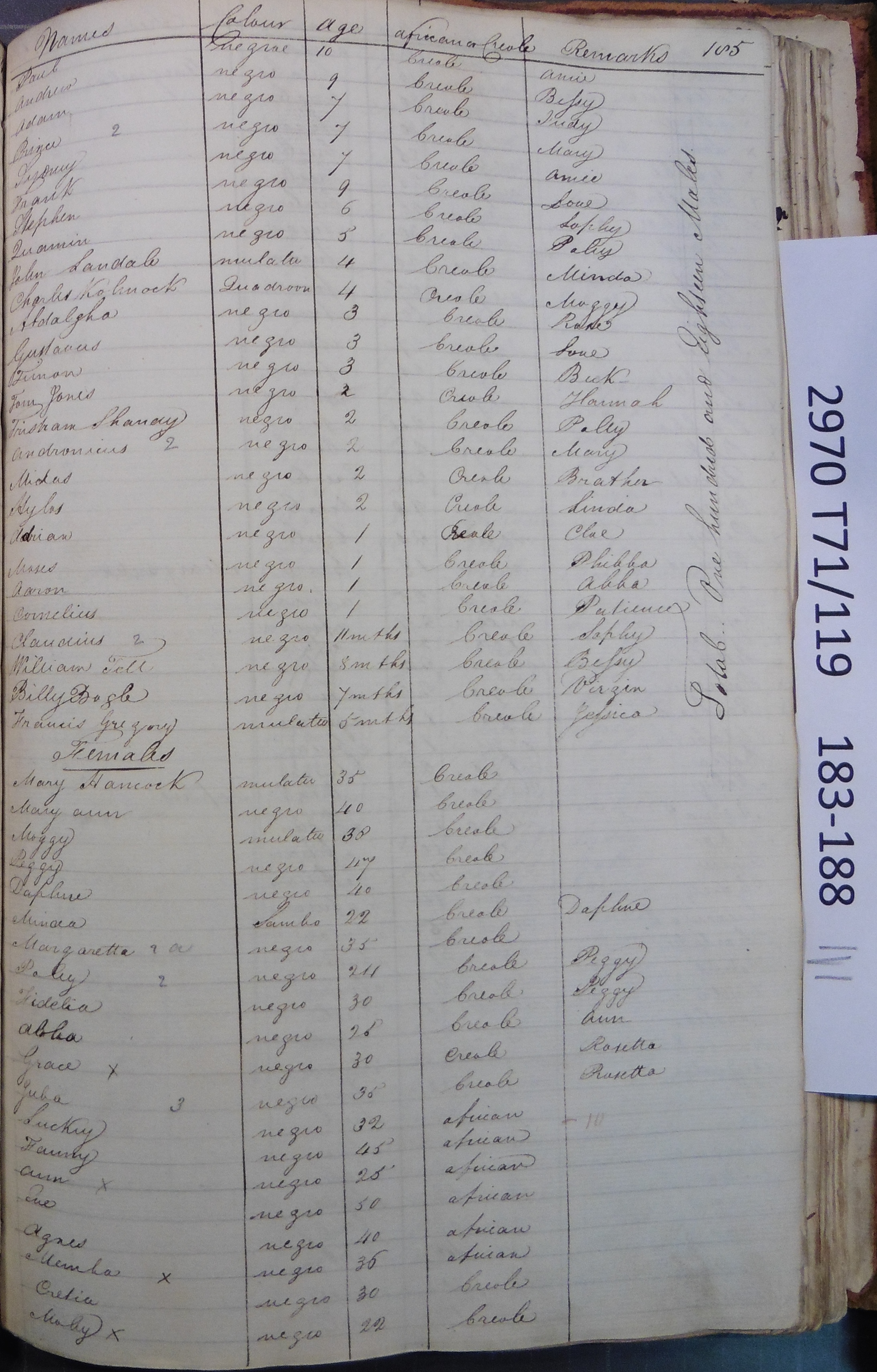 Slave register entry for Bloxburgh estate in 1817, page 3 of 6. T71/119 pp. 183-188. © Images reproduced by permission of The National Archives, London, England. The National Archives give no warranty as to the accuracy, completeness or fitness for the purpose of the information provided. Images may be used only for purposes of research, private study or education. Applications for any other use should be made to The National Archives, Kew, Richmond, Surrey TW9 4DU, Tel: 020 8392 5225 Fax: 020 8392 5266.