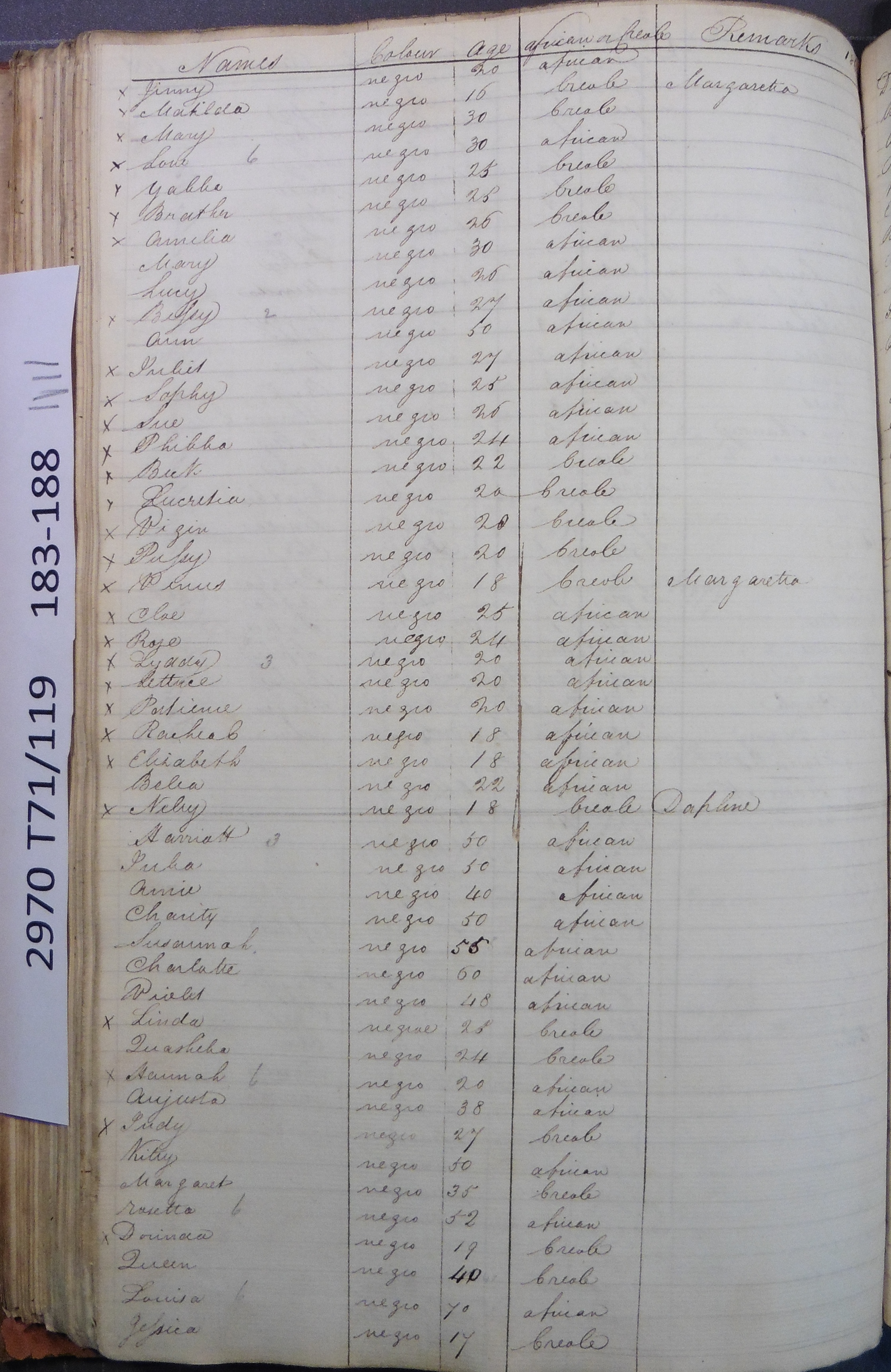 Slave register entry for Bloxburgh estate in 1817, page 4 of 6. T71/119 pp. 183-188. © Images reproduced by permission of The National Archives, London, England. The National Archives give no warranty as to the accuracy, completeness or fitness for the purpose of the information provided. Images may be used only for purposes of research, private study or education. Applications for any other use should be made to The National Archives, Kew, Richmond, Surrey TW9 4DU, Tel: 020 8392 5225 Fax: 020 8392 5266.