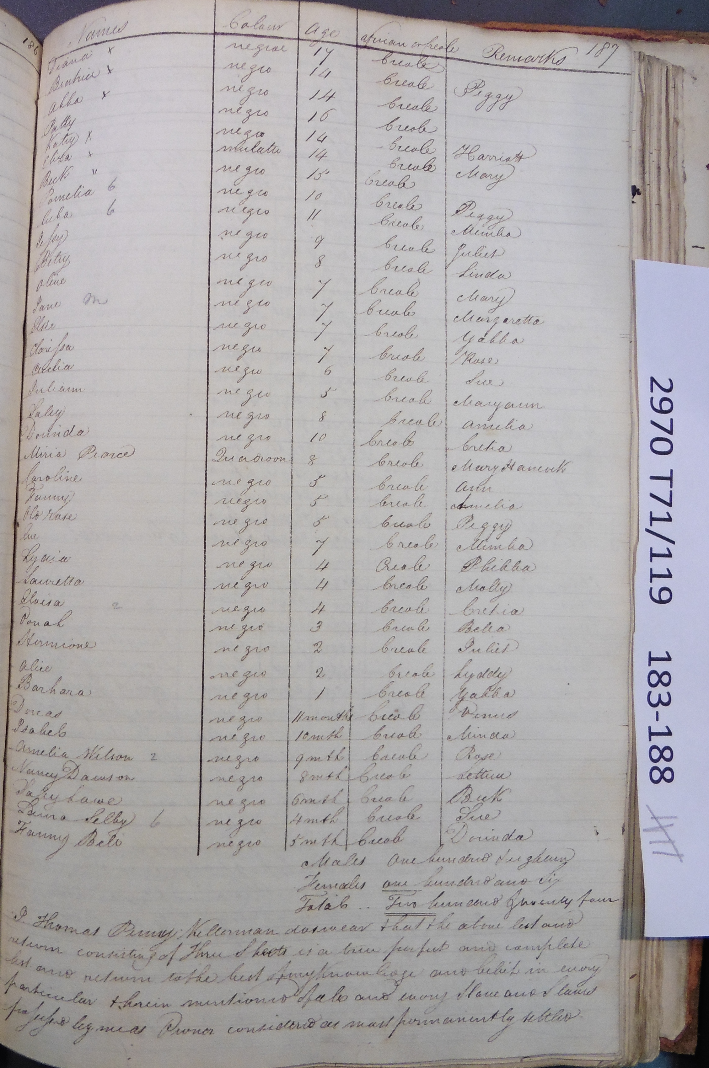 Slave register entry for Bloxburgh estate in 1817, page 5 of 6. T71/119 pp. 183-188. © Images reproduced by permission of The National Archives, London, England. The National Archives give no warranty as to the accuracy, completeness or fitness for the purpose of the information provided. Images may be used only for purposes of research, private study or education. Applications for any other use should be made to The National Archives, Kew, Richmond, Surrey TW9 4DU, Tel: 020 8392 5225 Fax: 020 8392 5266.