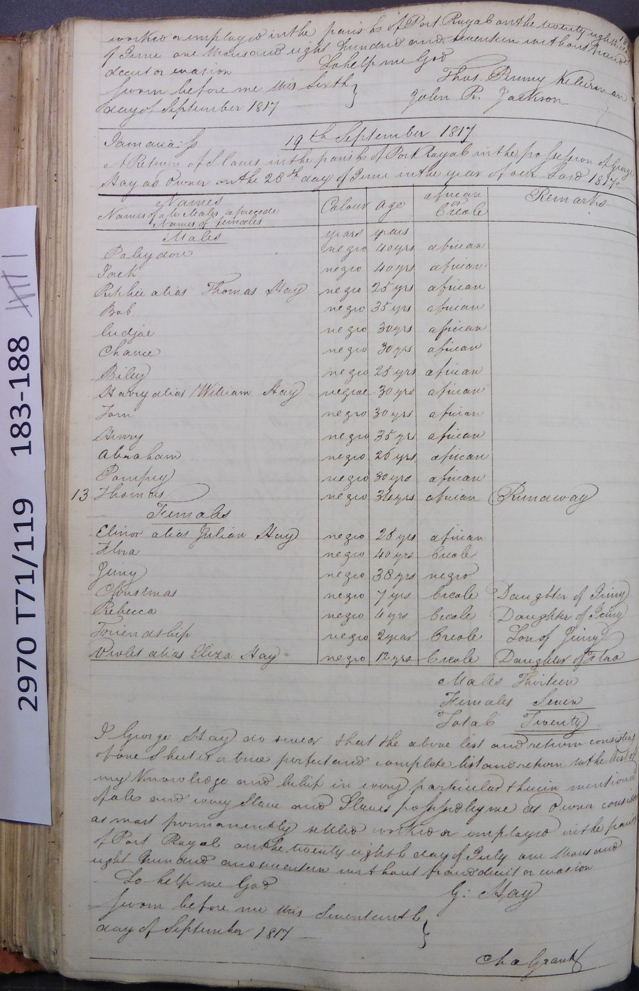 Slave register entry for Bloxburgh estate in 1817, page 6 of 6. T71/119 pp. 183-188. © Images reproduced by permission of The National Archives, London, England. The National Archives give no warranty as to the accuracy, completeness or fitness for the purpose of the information provided. Images may be used only for purposes of research, private study or education. Applications for any other use should be made to The National Archives, Kew, Richmond, Surrey TW9 4DU, Tel: 020 8392 5225 Fax: 020 8392 5266.