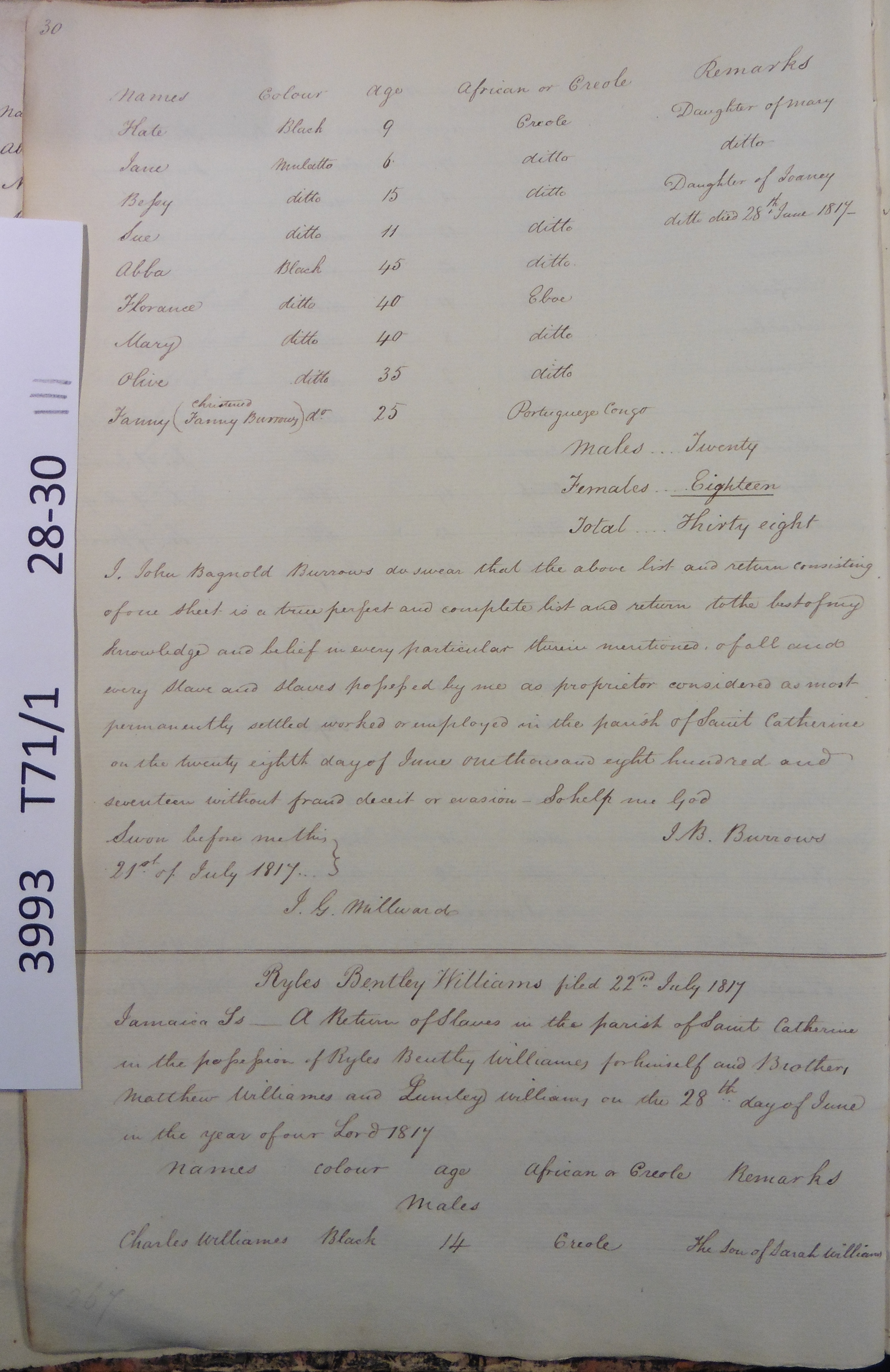 Slave regsiter entry for The Cottage in 1817, page 3 of 3. T71/1 pp. 28-30. © Images reproduced by permission of The National Archives, London, England. The National Archives give no warranty as to the accuracy, completeness or fitness for the purpose of the information provided. Images may be used only for purposes of research, private study or education. Applications for any other use should be made to The National Archives, Kew, Richmond, Surrey TW9 4DU, Tel: 020 8392 5225 Fax: 020 8392 5266.