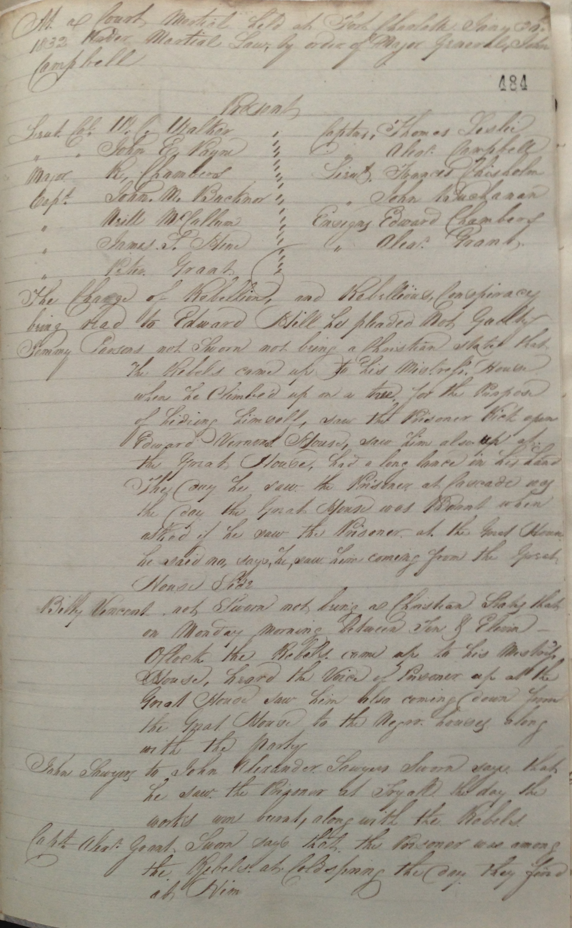 Trial of Edward Hill, page 1 of 2. Edward Hill from Great Valley was one of 60 people in Hanover tried by Court Martial for sedition in late January and early February 1832 following Sam Sharpe's War. They all pled not-guilty. 58 were found guilty, 2 were acquitted. Of those found guilty, 36, including Edward Hill, were sentenced to death (6 of these later had their sentences commuted to 50 or more lashes). Most of the trials were very short, without recorded cross-questioning and with no witnesses speaking in defence. CO137/185 part 3. © Images reproduced by permission of The National Archives, London, England. The National Archives give no warranty as to the accuracy, completeness or fitness for the purpose of the information provided. Images may be used only for purposes of research, private study or education. Applications for any other use should be made to The National Archives, Kew, Richmond, Surrey TW9 4DU, Tel: 020 8392 5225 Fax: 020 8392 5266.