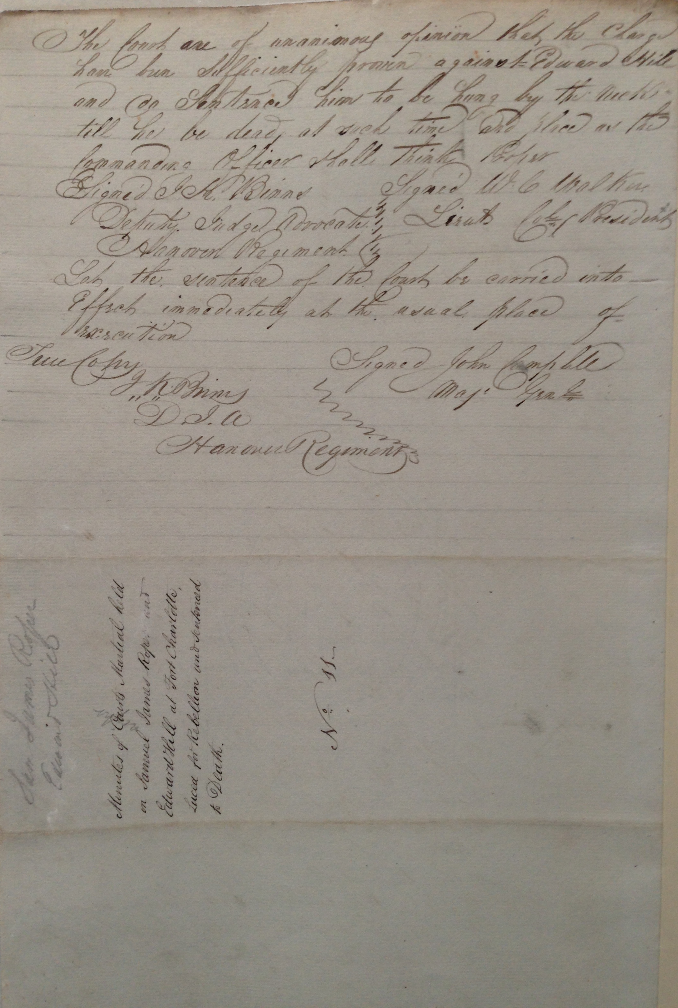 Trial of Edward Hill, page 2 of 2. Edward Hill from Great Valley was one of 60 people in Hanover tried by Court Martial for sedition in late January and early February 1832 following Sam Sharpe's War. They all pled not-guilty. 58 were found guilty, 2 were acquitted. Of those found guilty, 36, including Edward Hill, were sentenced to death (6 of these later had their sentences commuted to 50 or more lashes). Most of the trials were very short, without recorded cross-questioning and with no witnesses speaking in defence. CO137/185 part 3. © Images reproduced by permission of The National Archives, London, England. The National Archives give no warranty as to the accuracy, completeness or fitness for the purpose of the information provided. Images may be used only for purposes of research, private study or education. Applications for any other use should be made to The National Archives, Kew, Richmond, Surrey TW9 4DU, Tel: 020 8392 5225 Fax: 020 8392 5266.
