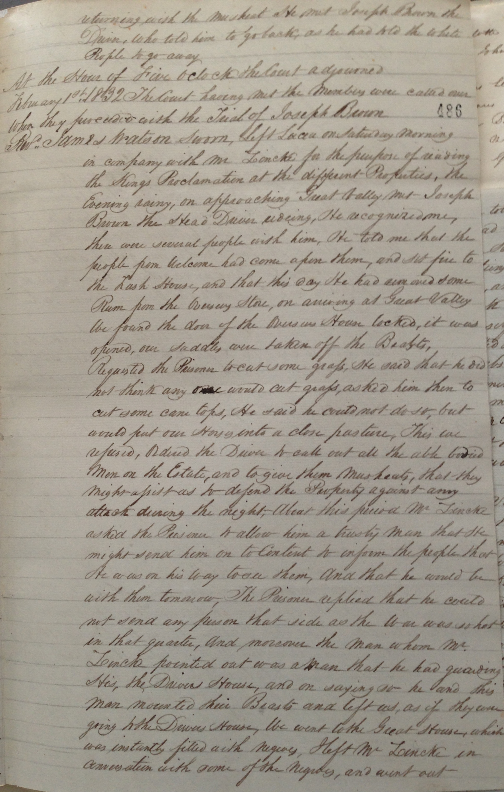 Trial of Joseph Brown, page 3 of 6. Joseph Brown was one of 60 people in Hanover tried by Court Martial for sedition in late January and early February 1832 following Sam Sharpe's War. Joseph Brown was the Head Driver and is the only one where the records show witnesses being cross-examined. Despite evidence from a missionary, James Watson, in his defence, Joseph Brown was found guilty and sentenced to death. CO137/185 part 3. © Images reproduced by permission of The National Archives, London, England. The National Archives give no warranty as to the accuracy, completeness or fitness for the purpose of the information provided. Images may be used only for purposes of research, private study or education. Applications for any other use should be made to The National Archives, Kew, Richmond, Surrey TW9 4DU, Tel: 020 8392 5225 Fax: 020 8392 5266.
