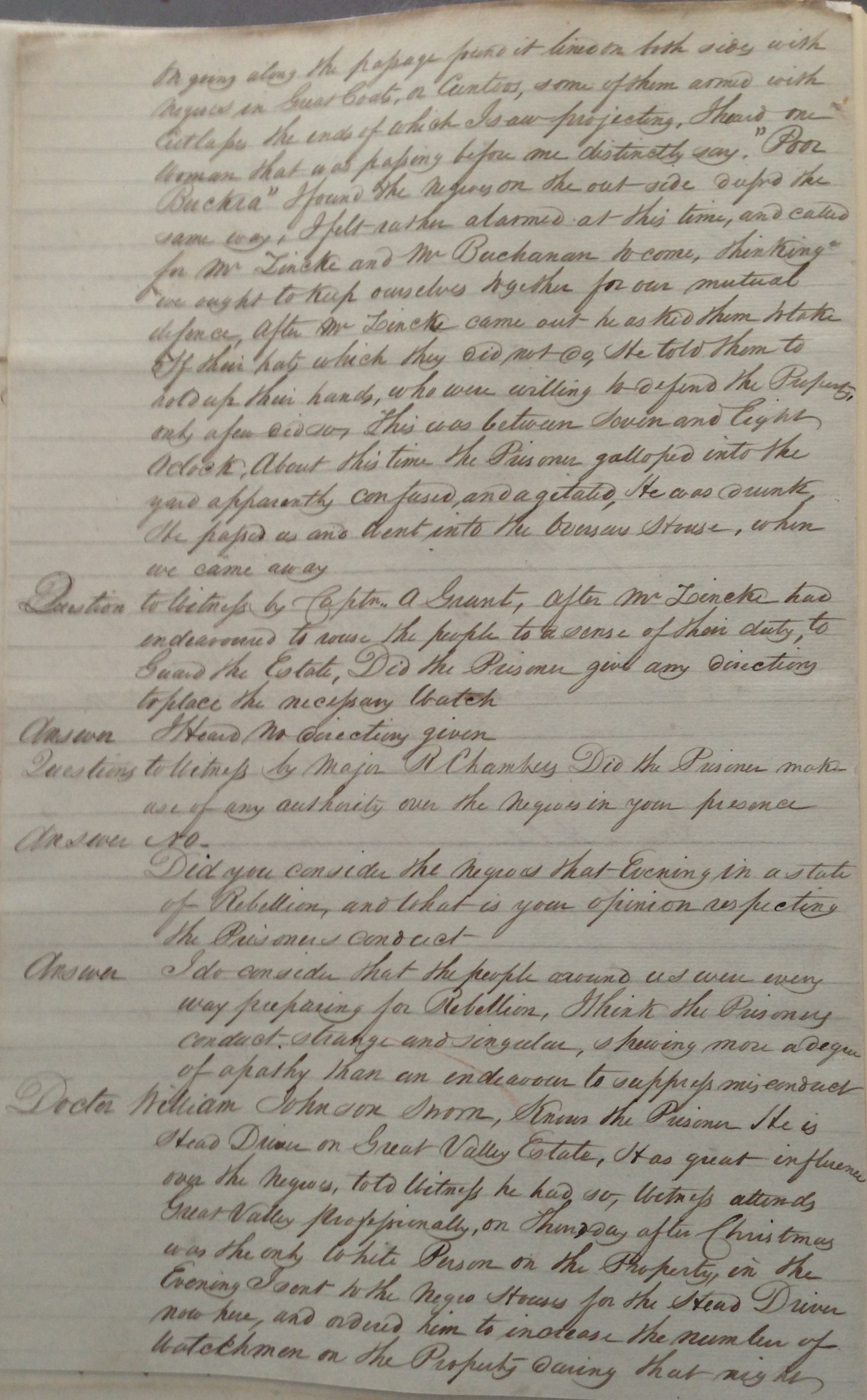 Trial of Joseph Brown, page 4 of 6. Joseph Brown was one of 60 people in Hanover tried by Court Martial for sedition in late January and early February 1832 following Sam Sharpe's War. Joseph Brown was the Head Driver and is the only one where the records show witnesses being cross-examined. Despite evidence from a missionary, James Watson, in his defence, Joseph Brown was found guilty and sentenced to death. CO137/185 part 3. © Images reproduced by permission of The National Archives, London, England. The National Archives give no warranty as to the accuracy, completeness or fitness for the purpose of the information provided. Images may be used only for purposes of research, private study or education. Applications for any other use should be made to The National Archives, Kew, Richmond, Surrey TW9 4DU, Tel: 020 8392 5225 Fax: 020 8392 5266.