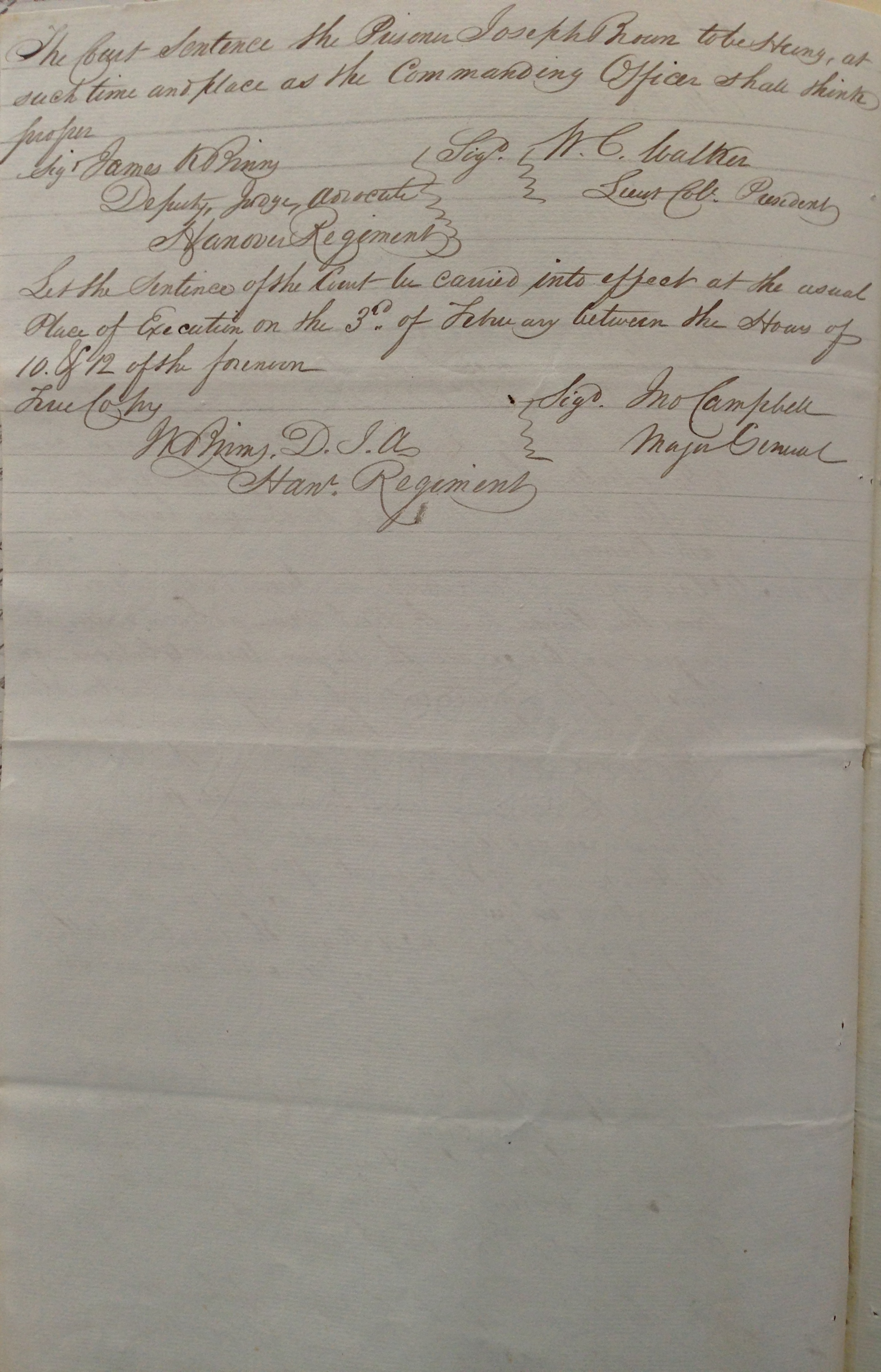 Trial of Joseph Brown, page 6 of 6. Joseph Brown was one of 60 people in Hanover tried by Court Martial for sedition in late January and early February 1832 following Sam Sharpe's War. Joseph Brown was the Head Driver and is the only one where the records show witnesses being cross-examined. Despite evidence from a missionary, James Watson, in his defence, Joseph Brown was found guilty and sentenced to death. CO137/185 part 3. © Images reproduced by permission of The National Archives, London, England. The National Archives give no warranty as to the accuracy, completeness or fitness for the purpose of the information provided. Images may be used only for purposes of research, private study or education. Applications for any other use should be made to The National Archives, Kew, Richmond, Surrey TW9 4DU, Tel: 020 8392 5225 Fax: 020 8392 5266.