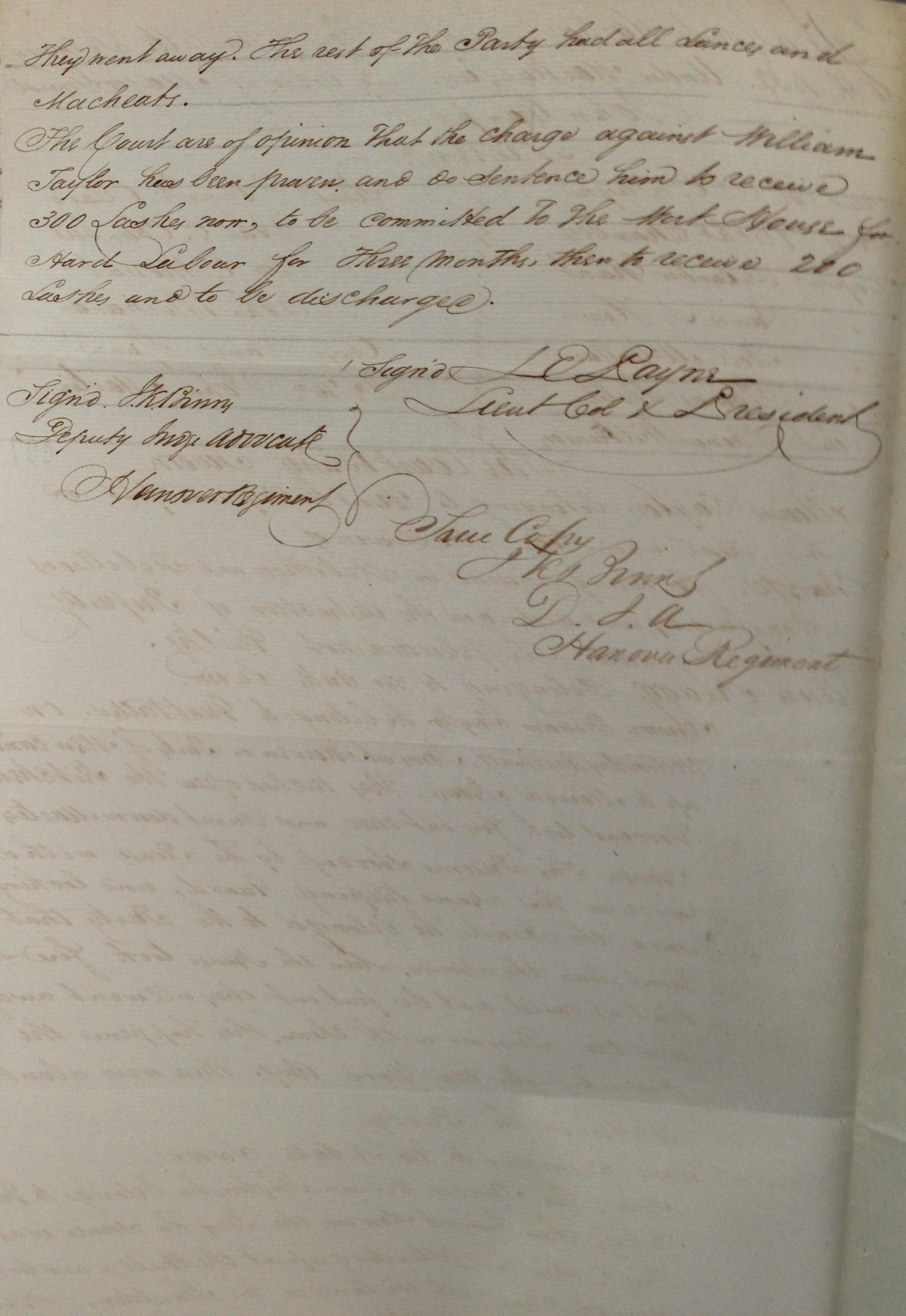 Trial of William Taylor, page 2 of 2. William Taylor from Great Valley was one of 60 people in Hanover tried by Court Martial for sedition in late January and early February 1832 following Sam Sharpe's War. They all pled not-guilty. 58 were found guilty, 2 were acquitted. Of those found guilty, 36 were sentenced to death (6 of these later had their sentences commuted to 50 or more lashes). William Taylor himself was sentenced to 300 lashes, 2 months hard labour and a further 200 lashes before his release. Most of the trials were very short and there were no witnesses recorded as giving evidence in defence of the accused except for the 2 people who were acquitted. CO137/185 part 3. © Images reproduced by permission of The National Archives, London, England. The National Archives give no warranty as to the accuracy, completeness or fitness for the purpose of the information provided. Images may be used only for purposes of research, private study or education. Applications for any other use should be made to The National Archives, Kew, Richmond, Surrey TW9 4DU, Tel: 020 8392 5225 Fax: 020 8392 5266.