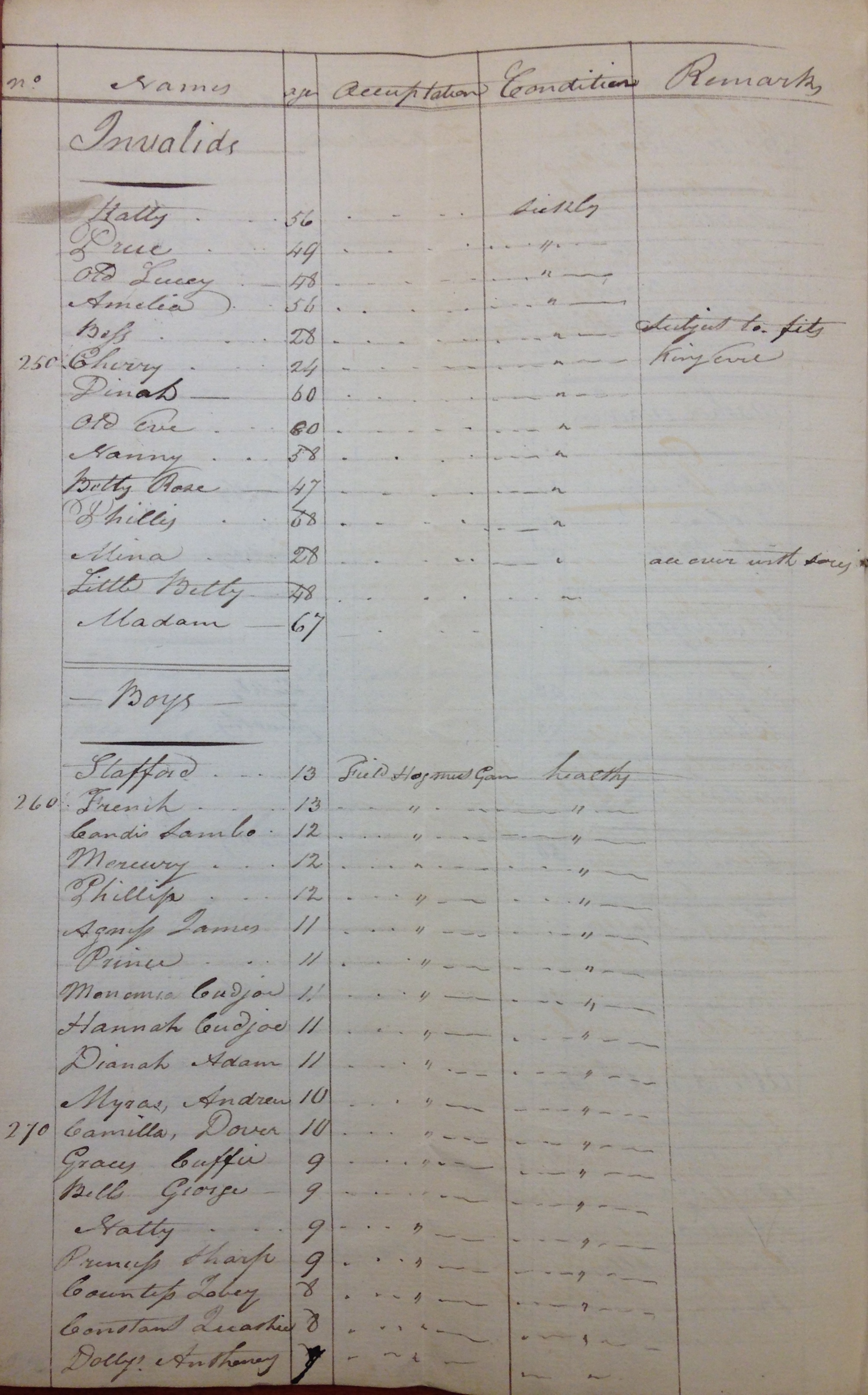 A list of enslaved people on Hope estate in 1813 with details of ages, parentage, occupation and general health, page 10 of 13. Source: 'A General List of Negroes on Hope Estate, 1st January 1813', Stowe Papers, West Indies Box 1, folder 12, The Huntington Library, San Marino, California.