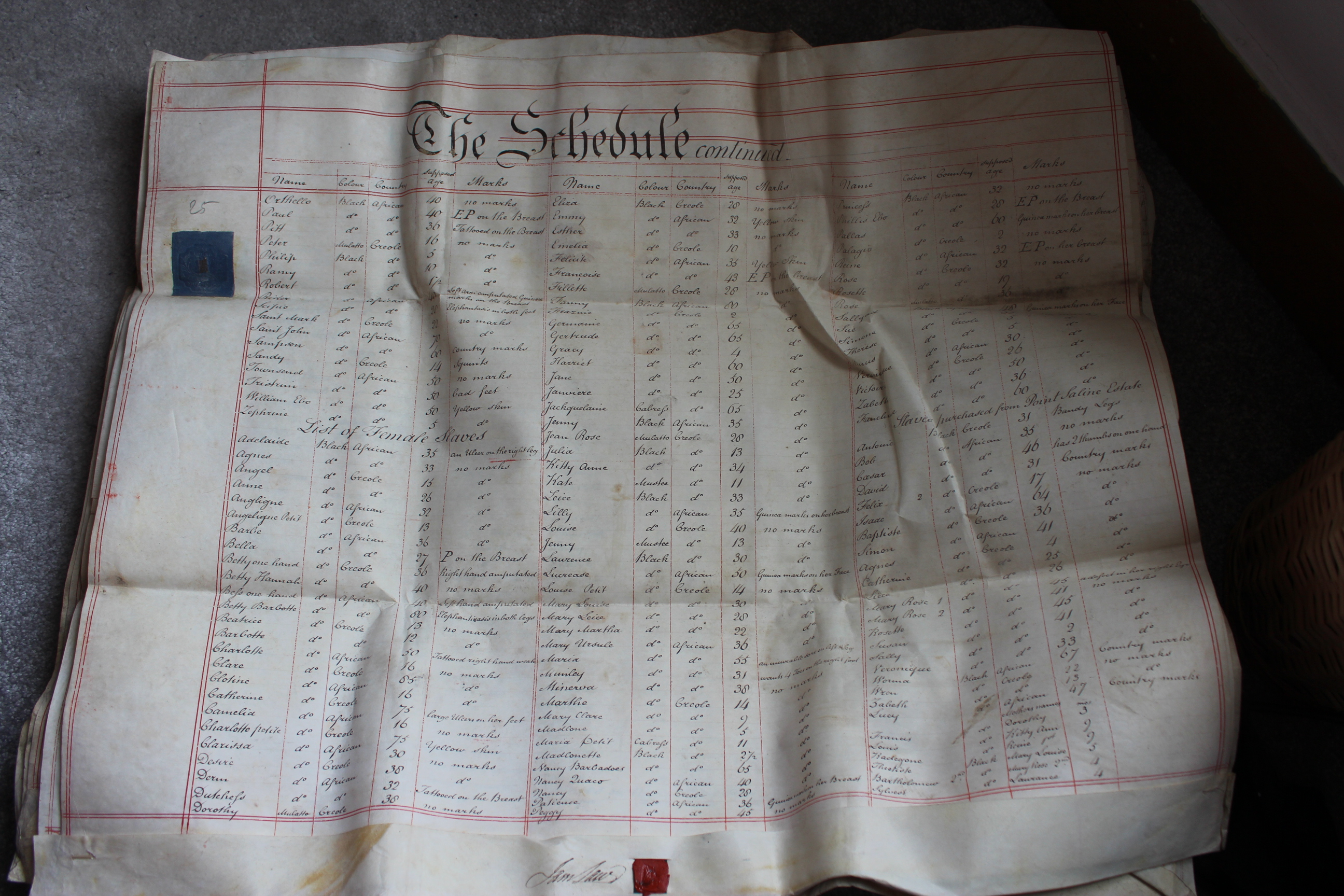 Schedule of enslaved people on Upper and Lower Pearl estate in 1819 listed as part of the indenture whereby the estates were conveyed to John Goodson. Page 2 of 4.