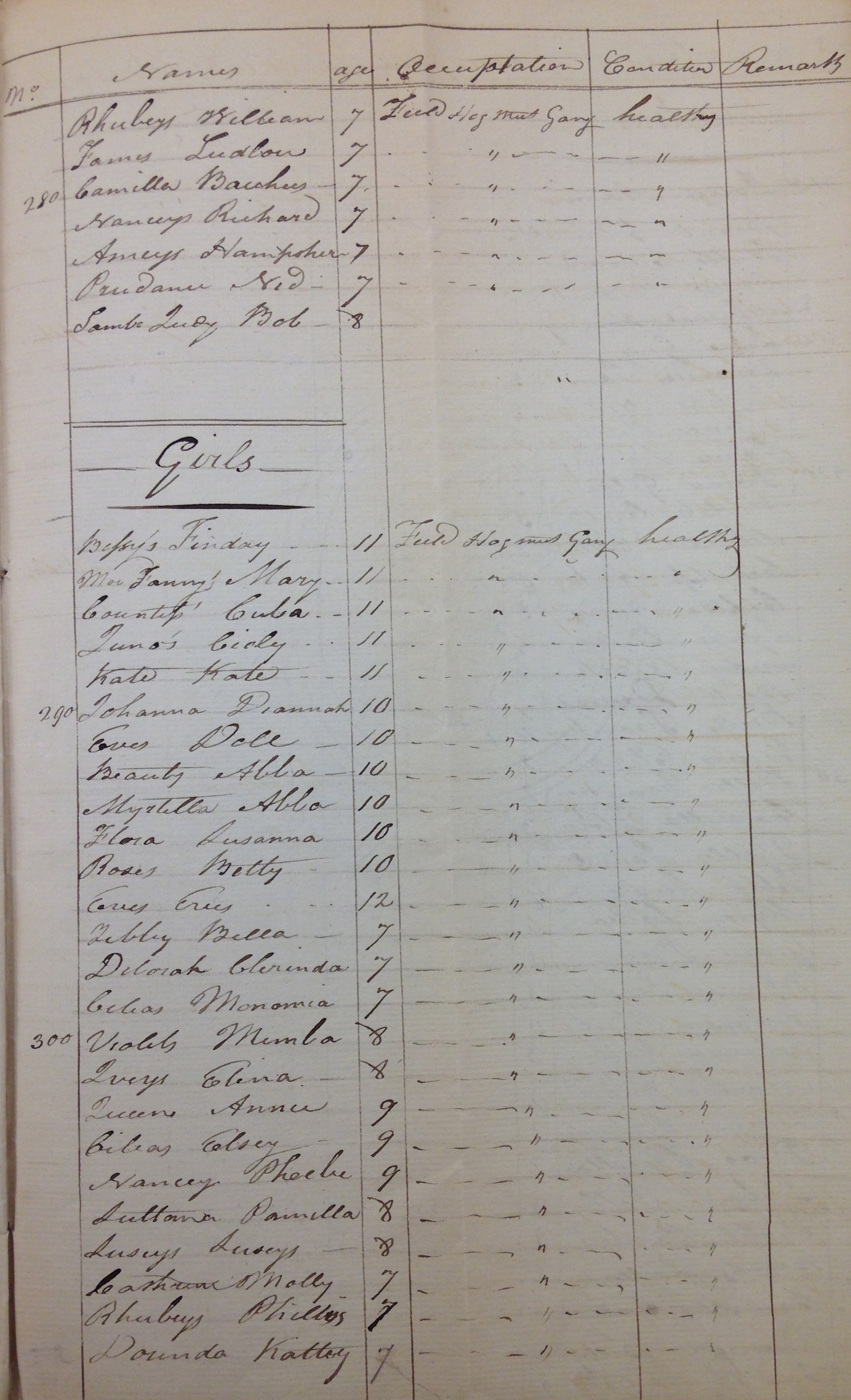 A list of enslaved people on Hope estate in 1813 with details of ages, parentage, occupation and general health, page 11 of 13. Source: 'A General List of Negroes on Hope Estate, 1st January 1813', Stowe Papers, West Indies Box 1, folder 12, The Huntington Library, San Marino, California.