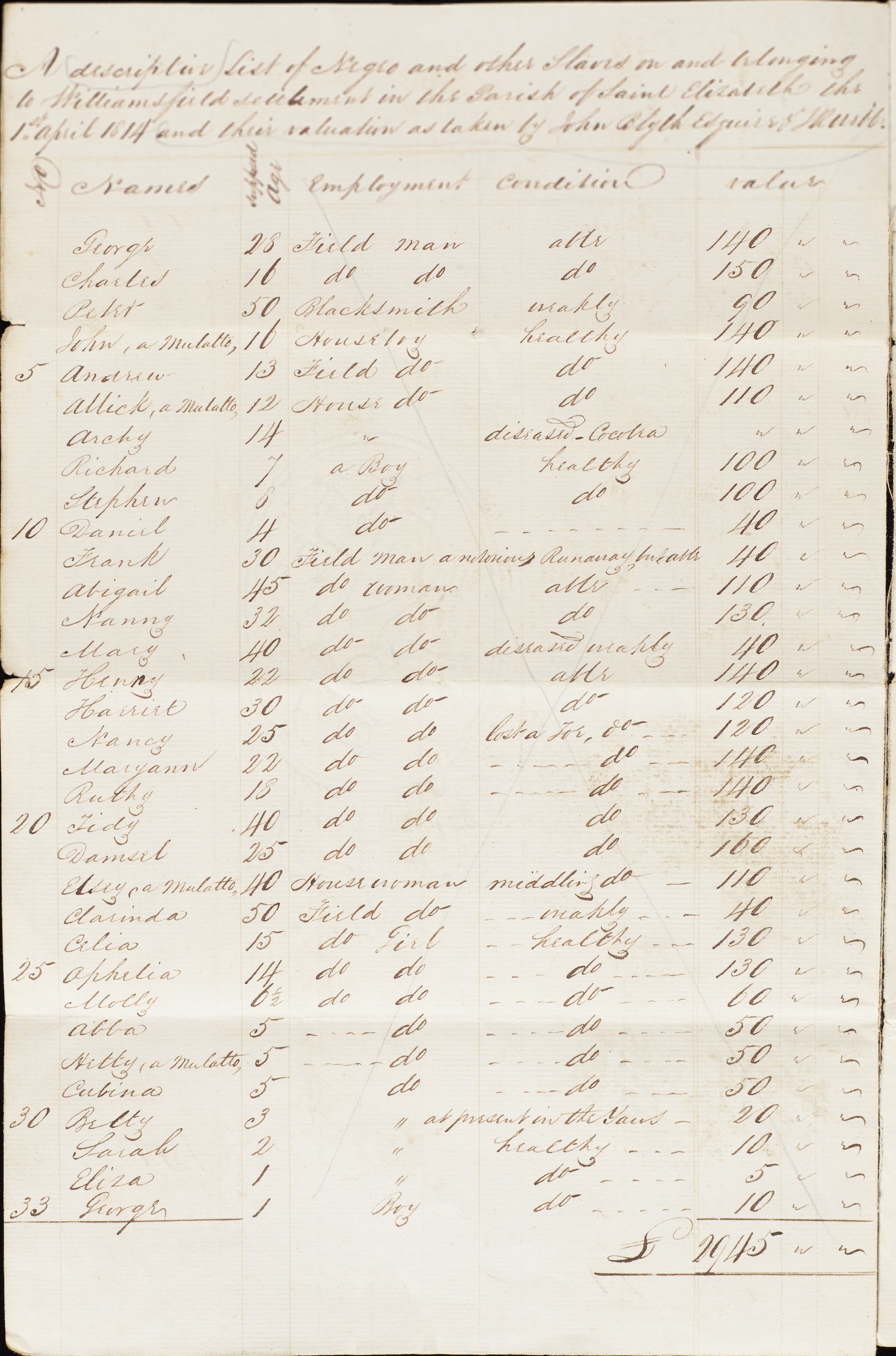 2. An inventory and valuation of enslaved persons at Williamsfield settlement, St Elisabeth parish, Jamaica, 1814.